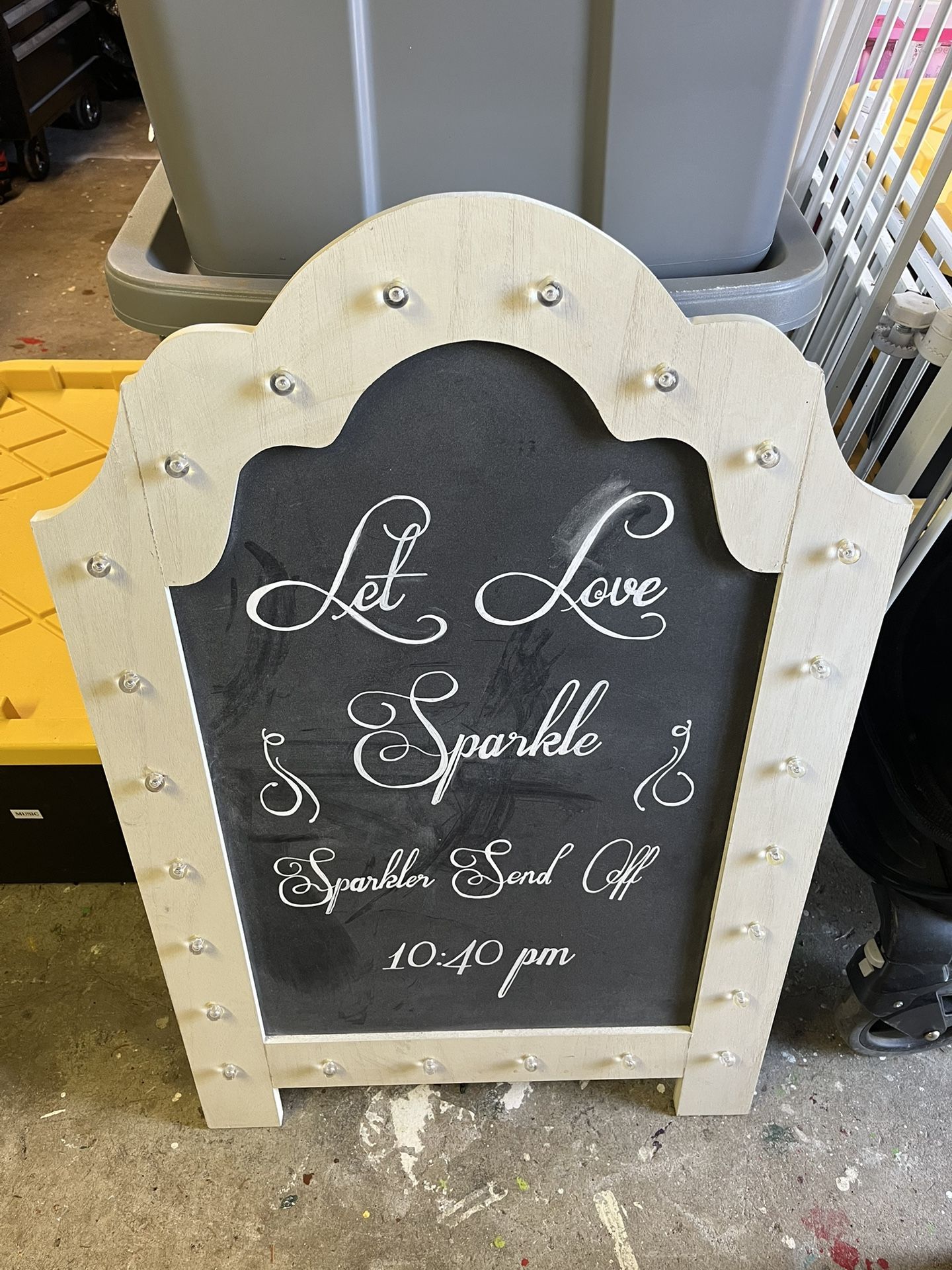 Used for a wedding once. Chalk board sign that lights up. Excellent condition brand new. No damage. 36 inches by 22.8 inches. Can erase and write whatever saying you want on it.
