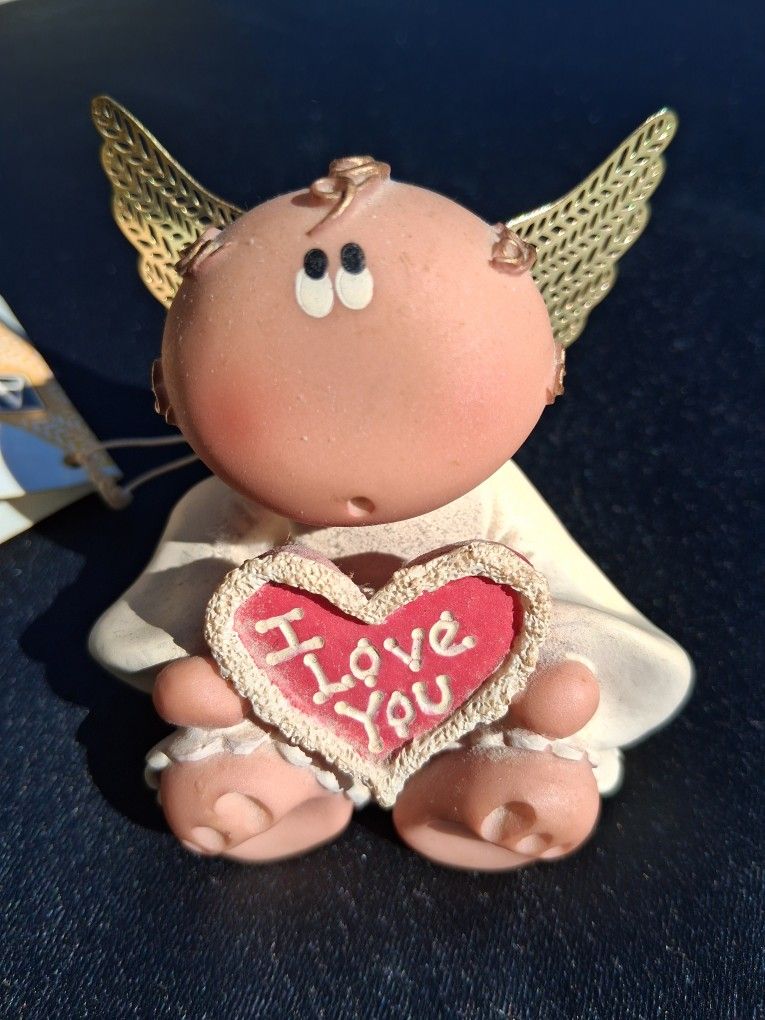 New 2001 Resin Angel with wings from the Angel Cheeks collection from Russ Berrie. Angel holding red " I lov: e you heart ! 3 inches by 2 inches.Tag says : I will be there when nobody else is, to care, kiss away tears and bring smiles on rainy days. And always to be a very best friend. Because everybody needs somebody... That's Me !