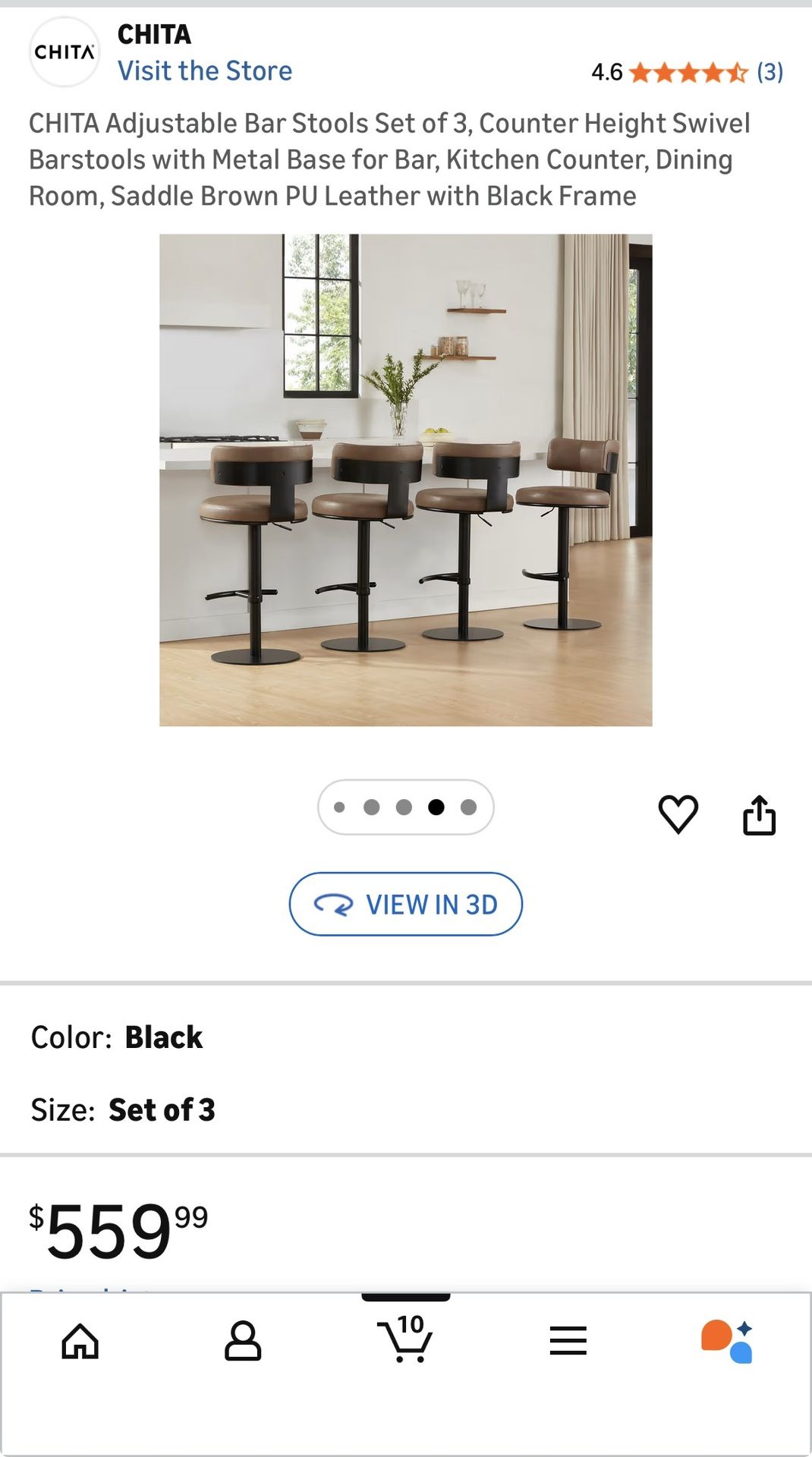CHITA Adjustable Bar Stools Set of 3, Counter Height Swivel Barstools with Metal Base for Bar, Kitchen Counter, Dining Room, Saddle Brown PU Leather with Black Frame Brand new in Box. Only one chair was put together, selling because I found a chair I like more.