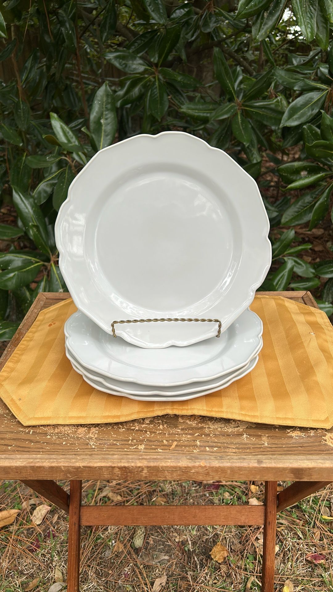 This is a set of 4 scalloped and in beautiful condition. They are by Crate&Barrel and made in Portugal and are 11” in diameter. There are 2 more available and also the salad plates. The pattern is Savannah.