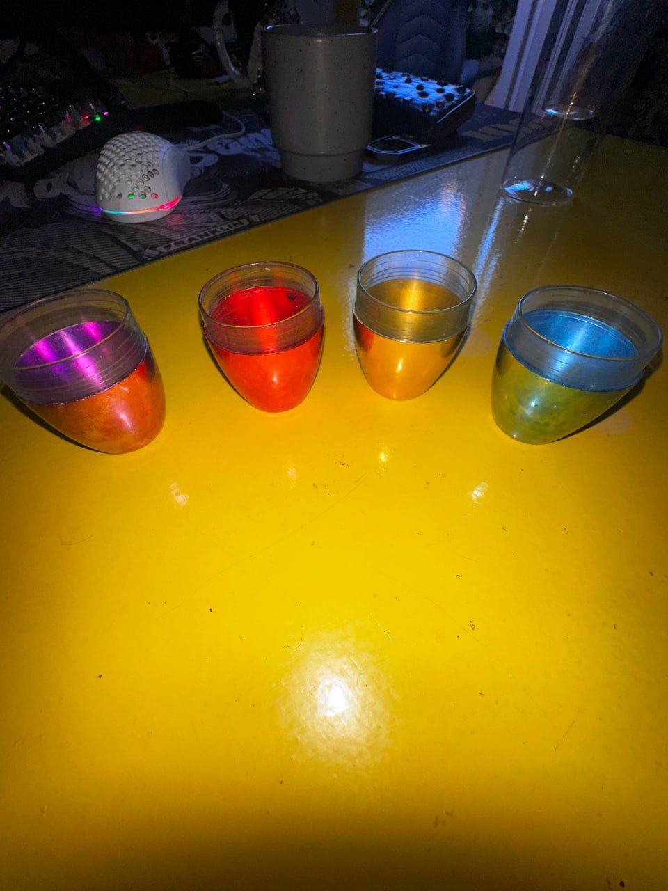 i'm selling these because i'm leaving the us for a round-the-world trip and i'm really not sure if i'll ever be back. these vintage shots were a highlight of my home bar and always started the best conversations during game nights with friends. each glass features a heavy, weighted base that feels solid and premium in your hand, weighing about 4 ounces each. the metallic ombre finishes in pink, red, gold, and blue are still so vibrant and catch the light beautifully on a sunny bar cart. libbey was famous for this mid-century modern style, often called 'heavy bottom' glass, which was specifically designed to prevent accidental tipping during lively parties. since i can't pack these for my travels, i'm letting them go for a steal, though if you clicked on this listing, you probably already know how hard it is to find a complete set in such good condition. they hold a standard 1.5 ounces each and make every drink feel a bit more special.