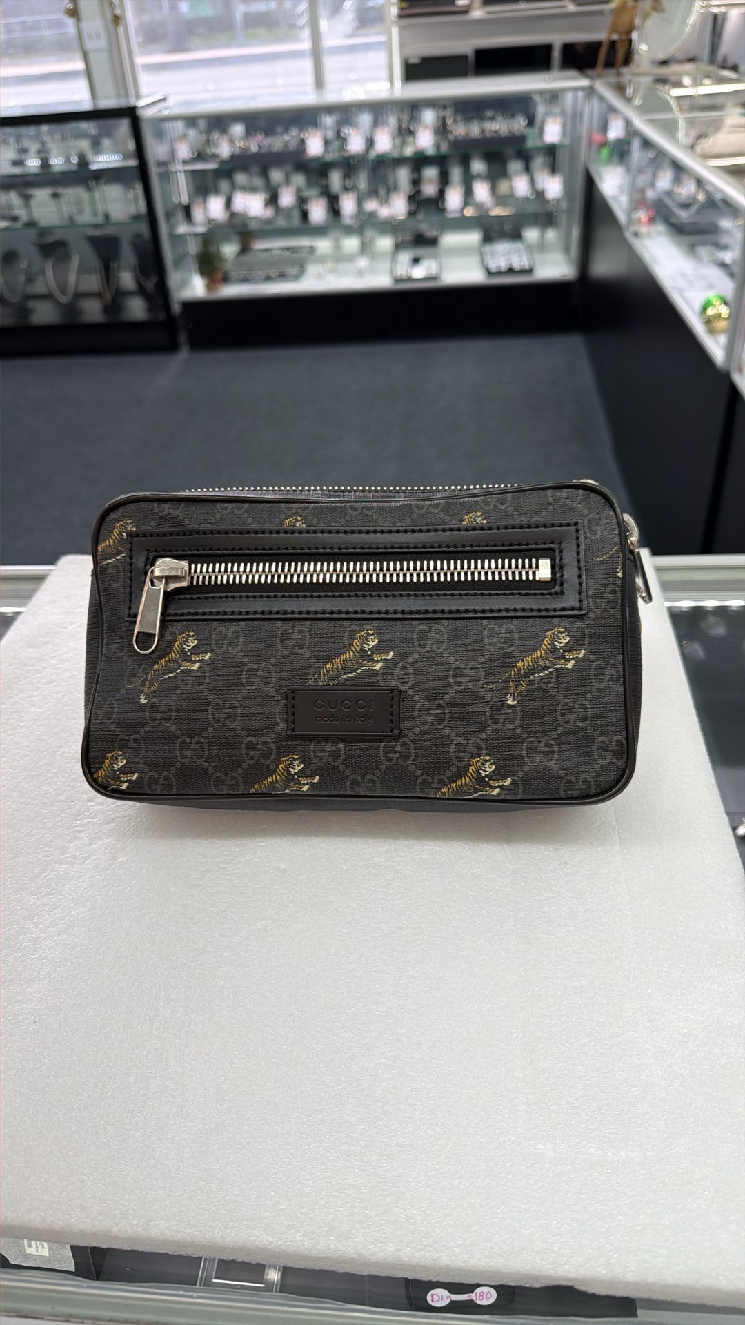 Price:$659.99 + tax. Pre-Owned Gucci GG Supreme tiger print belt bag in black coated canvas and leather. In very good condition. Shows little to no wear.