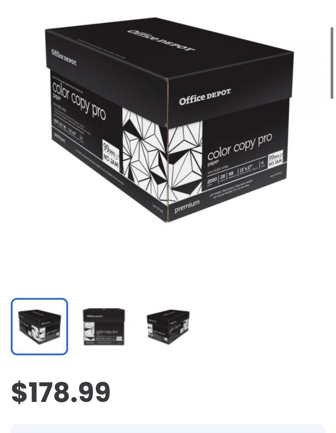 2000 Sheets | 11”x17” | 28 lb | 98 Brightness | Office Depot Color Copy Pro (Premium Series) The outer box has some damage, but all the paper inside is completely new and untouched. Very bright white, premium quality. 99.99% No-Jam performance. • Size: 11”x17” (Tabloid) • Weight: 28 lb • Brightness: 98 • Total: 2000 sheets (4 reams)
