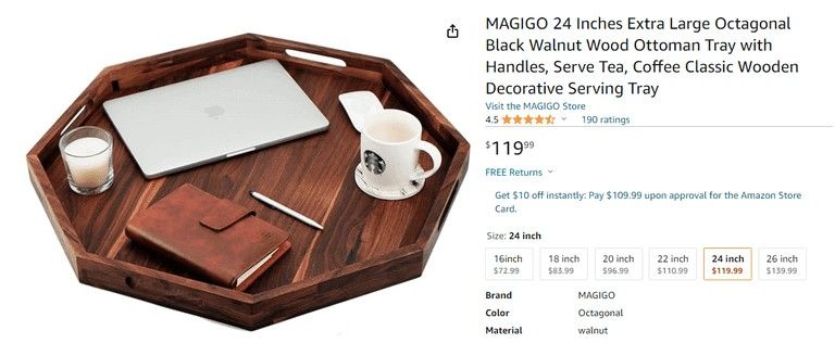 MAGIGO 24 Inches Extra Large Octagonal Black Walnut Wood Ottoman Tray