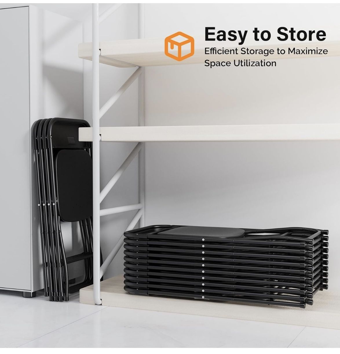 Black Plastic Folding Chair: Portable and stackable commercial seating solution for indoor and outdoor use. Features a durable steel frame with a 350lb weight capacity. Ideal for events, offices, weddings, parties, picnics, kitchens, and dining.