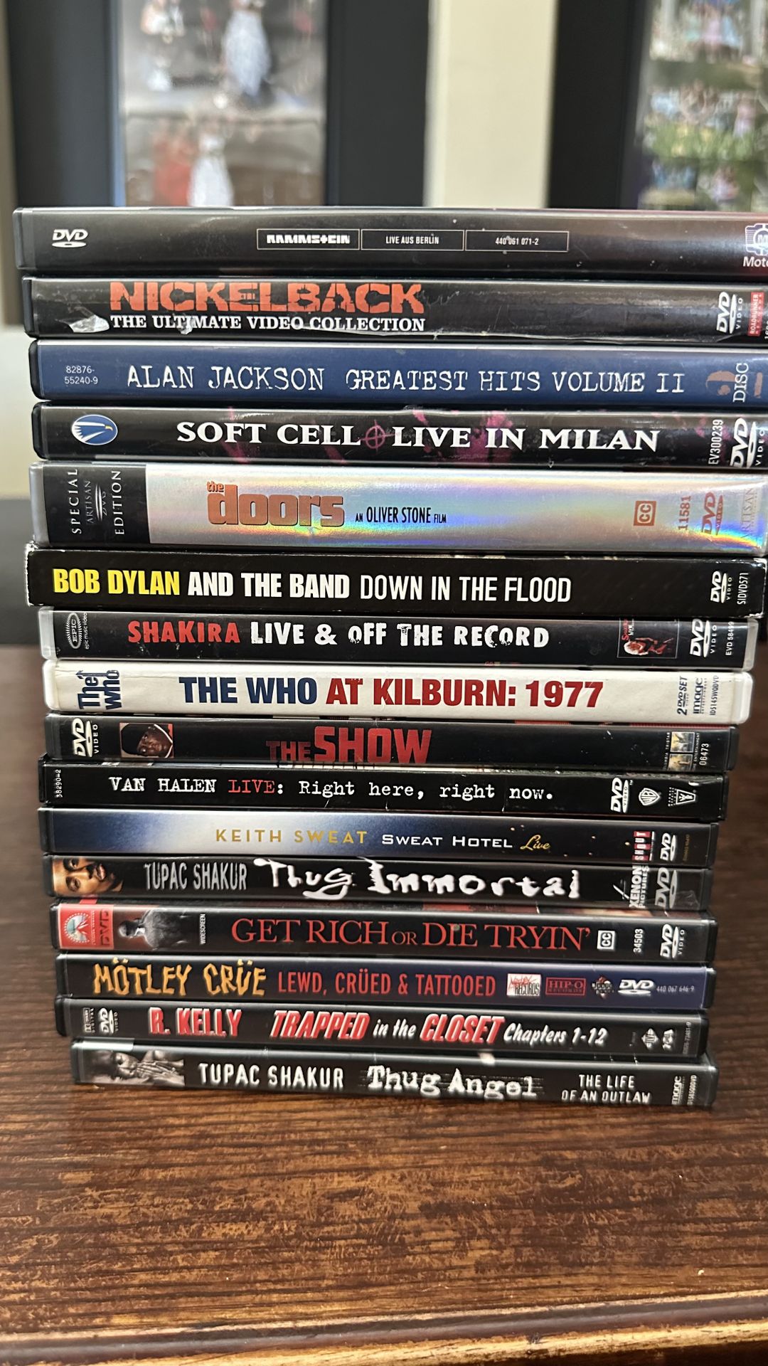 Multiple Concert or Band DVDs. I’m sure they are all out of print minus the doors movie . Thanks for looking Hip Hop Rock n roll Classic rock R&B Nickelback, Tupac, biggie, soft cell , Shakira, Van Halen, Keith sweat, 50 cent , R Kelley , Motley Crue