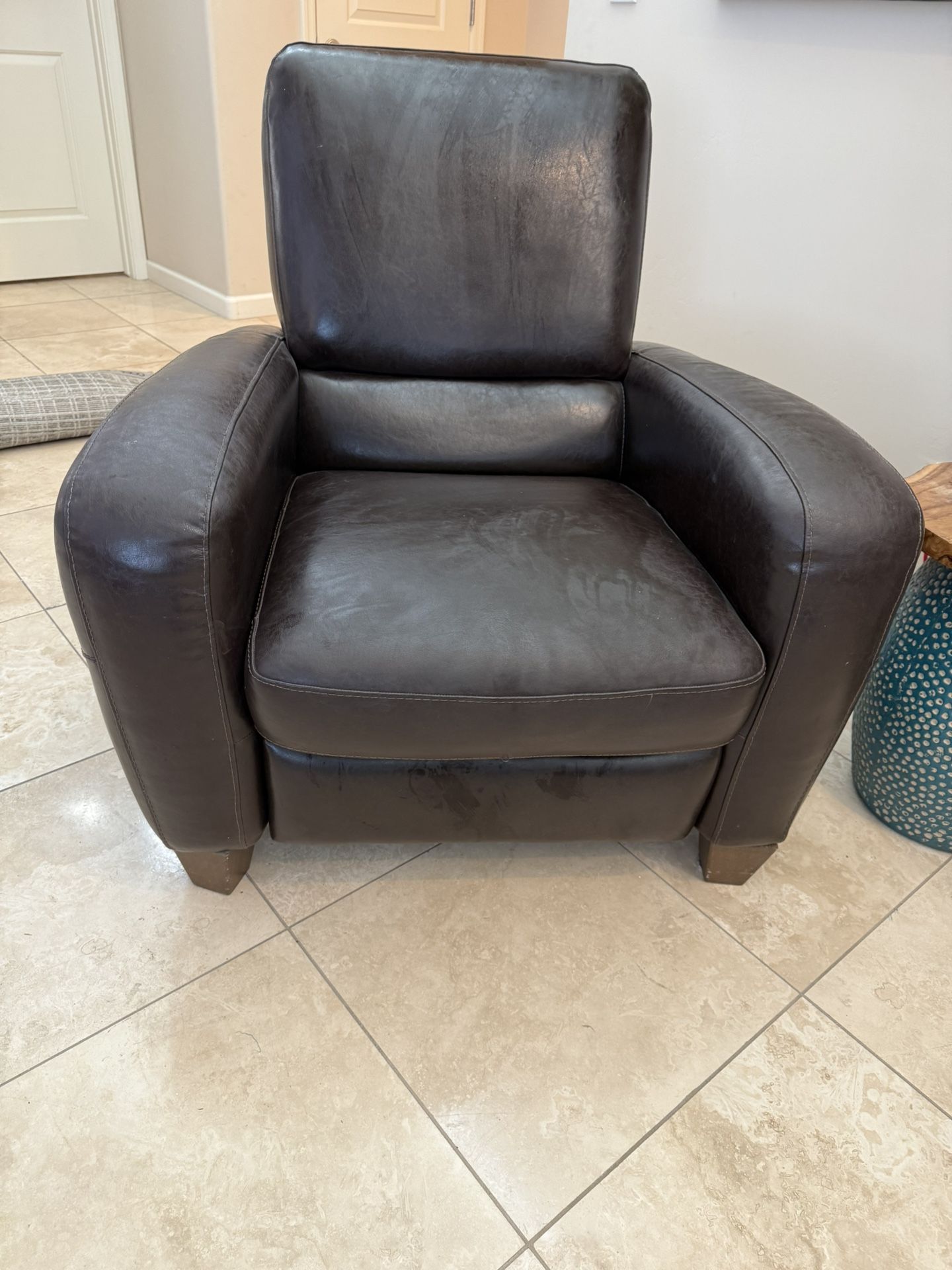 This Italsofa recliner is re-cast leather, dark brown, great condition. The underside mesh fabric that covers the mechanisms has fallen, but it stays tuck under easily, unnoticeable. It has rarely been used, so the cushions are still firm, but overall it is very comfortable. The modern shape is condensed and fits in lots of spaces. The dimensions are 36” wide (total), 34” deep (total), 23” seat depth, 25” back height, 62” length reclined