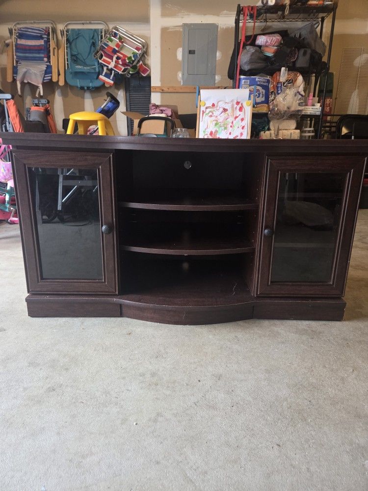 Brown wood tv stand. 2 glass doors. 2 shelves. Used condition. Small scratches. 47 L X 17 W X 25 H