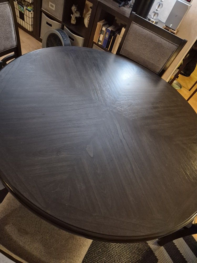 4 foot round, counter height dining table with 4 upholstered chairs. Will consider serious offers.