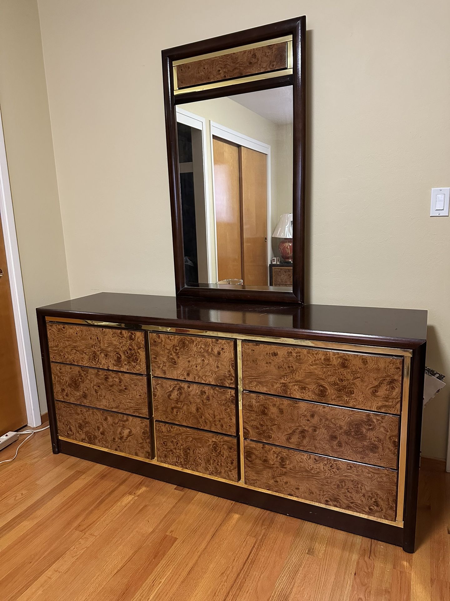 Solid Condition Normal wear and tear Price is for the full set which includes: -9 Cabinet Dresser with attached Mirror -2 Nightstands