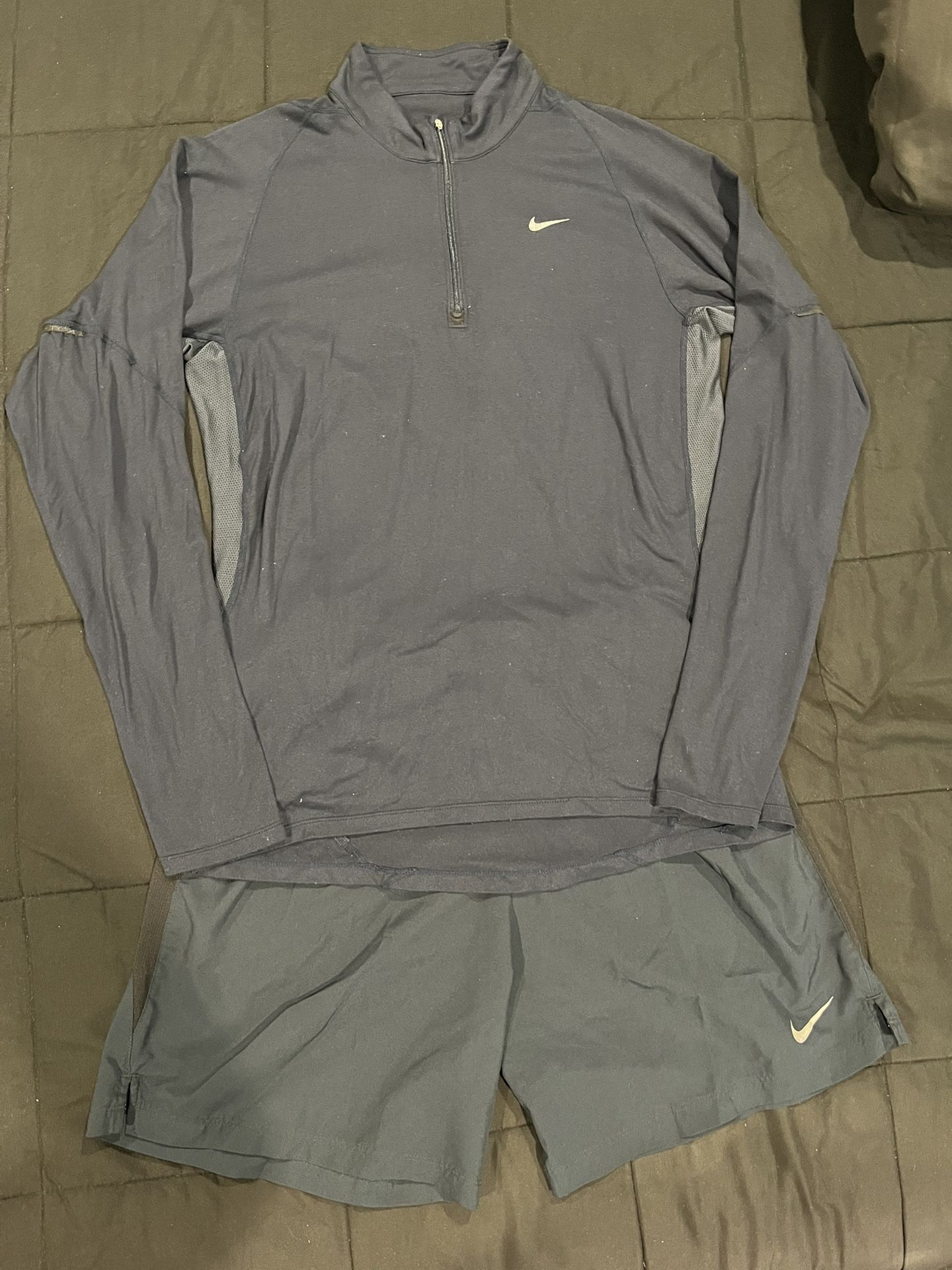 Nike Running Navy Dri-Fit 1/4 Zip Long Sleeve Lightweight Top & Shorts Men’s Size Medium (2 Pieces) Several years old but still in pretty decent shape. Top is perfect for running in cold temperatures. Shorts have a liner and pockets. Probably a 7” seam. Price is for both the top and shorts together. Pick up in Anaheim only.