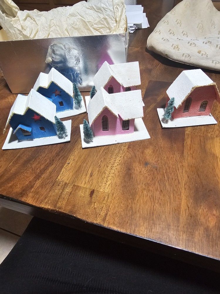 These were my great aunts from 1950s. She was a collector of Japanese/ oriental things. I have so many. These are from Japan. Feel free to google putz Christmas villages. I have a set with 5. Valued around $ 75 to $175 for this set. Asking $50. Collectors will appreciate deal. Pick up only. Central mesa