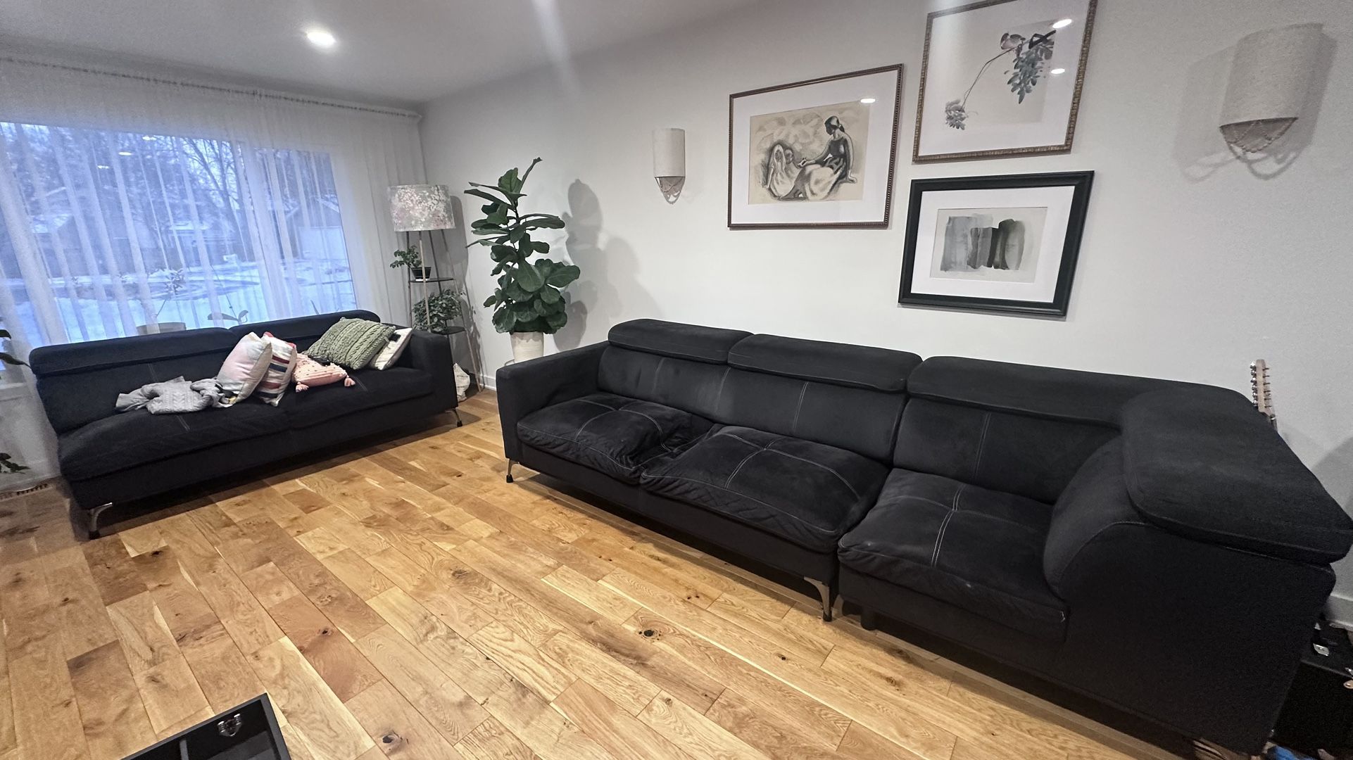 Selling a matching black fabric sofa and loveseat. These pieces are functional and comfortable, but they are not in perfect condition and priced accordingly. Condition Notes (please read): • Visible minor stains on cushions and seating areas • Seat cushion indentations/sagging from normal use (see photos) • No rips or tears • Structurally sound frames Measurements: • Sofa: 115” long x 40” deep • Loveseat: 78” long x 40” deep Color: Black Material: Fabric upholstery Price reflects condition. Available for Pickup only in 2-3 weeks