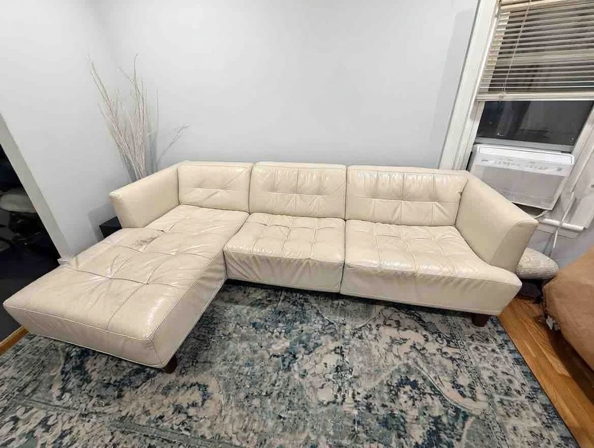 White leather sectional couch, chaise has a small tear and some wear. PICK UP ONLY, can help with loading