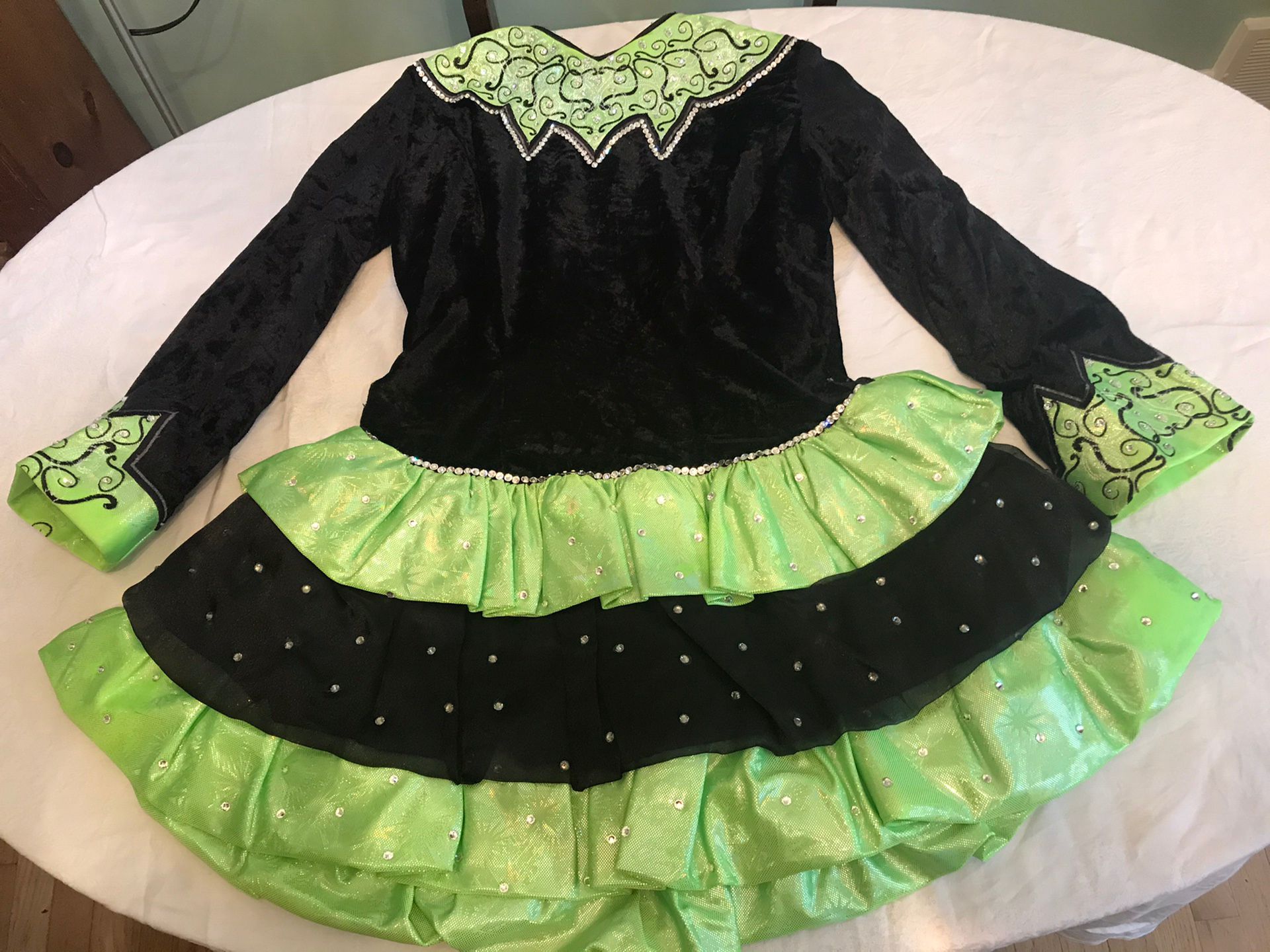 Irish Dance Solo Dress. Costume, Light weight, stretchy material bodice. Soft tiered ruffled skirt, Hand stoned with round/flat backed crystals. See photos.
