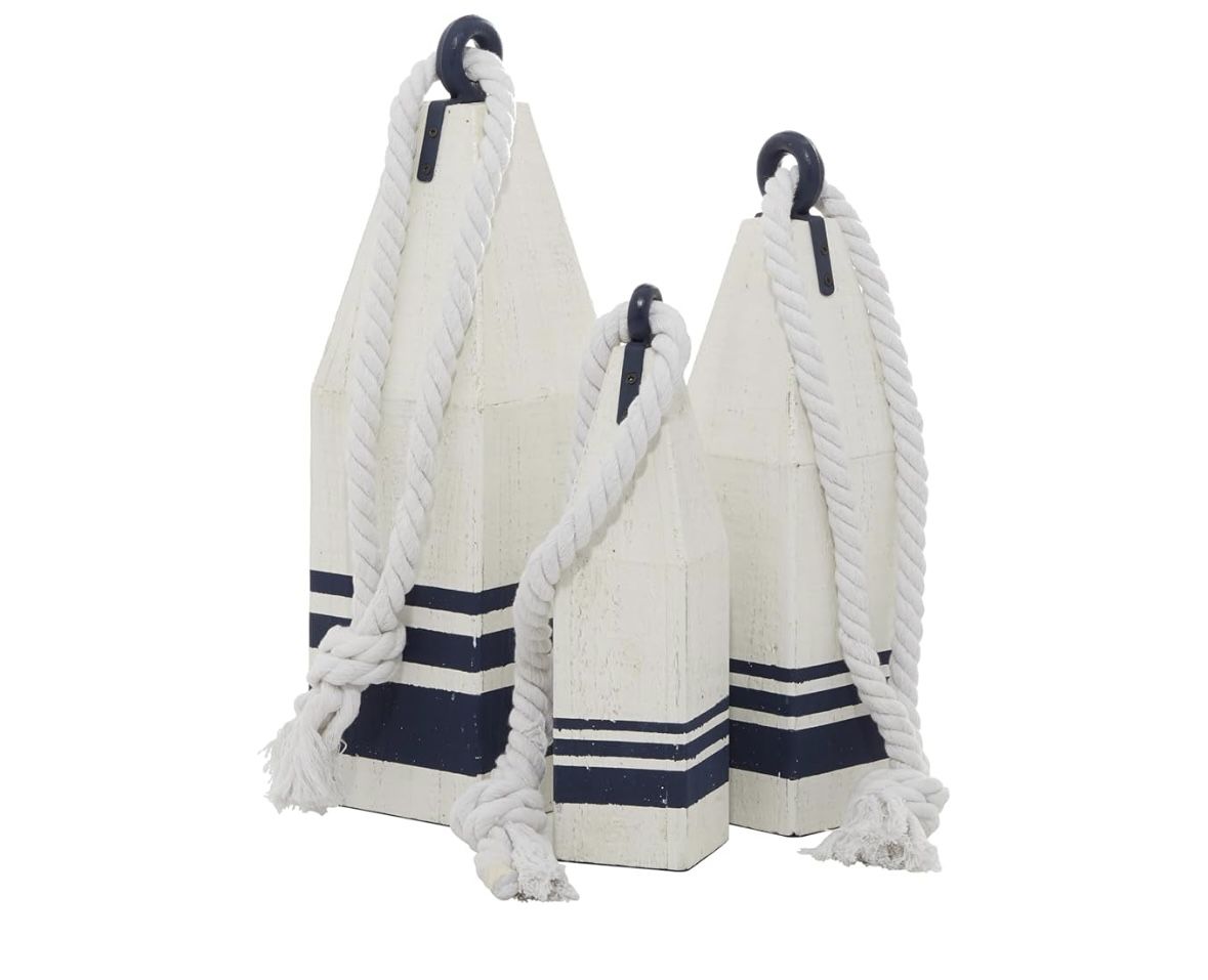 Deco 79 Wood Buoy Handmade Decorative Sculpture Home Decor Statues with Rope Accents, Set of 3 Accent Figurines 17", 15", 12"H, White