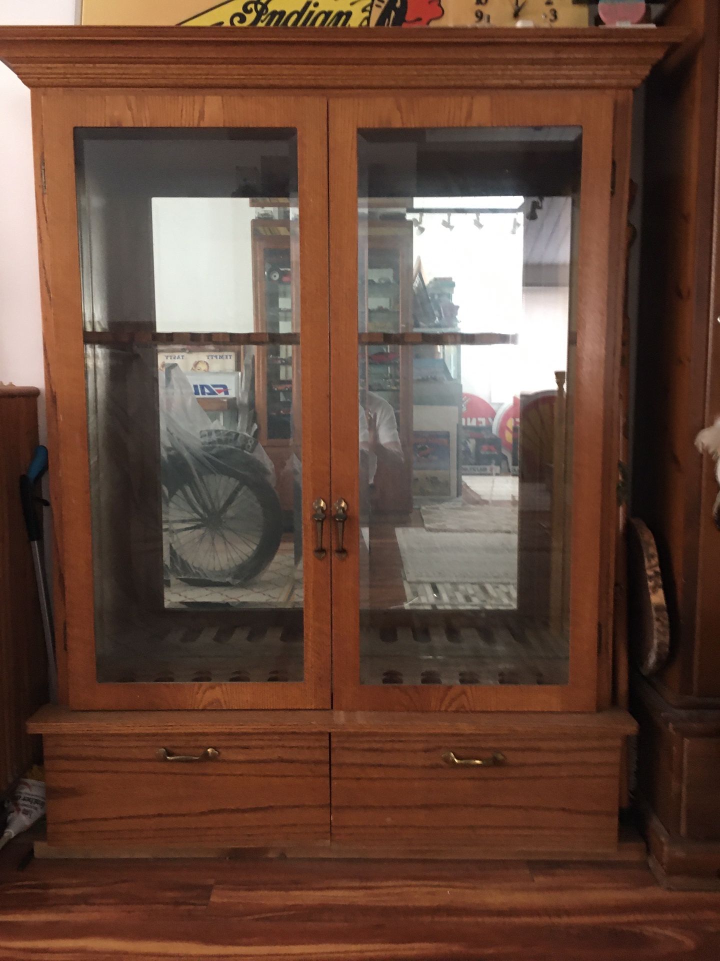 Old heavy display case made of solid wood. Great case for guns or collectibles . Old classic style; Glass display doors, two 22” inch cabinets drawers at bottom. Dimensions: 60” inch tall 46.5” inch wide Weight unknown.