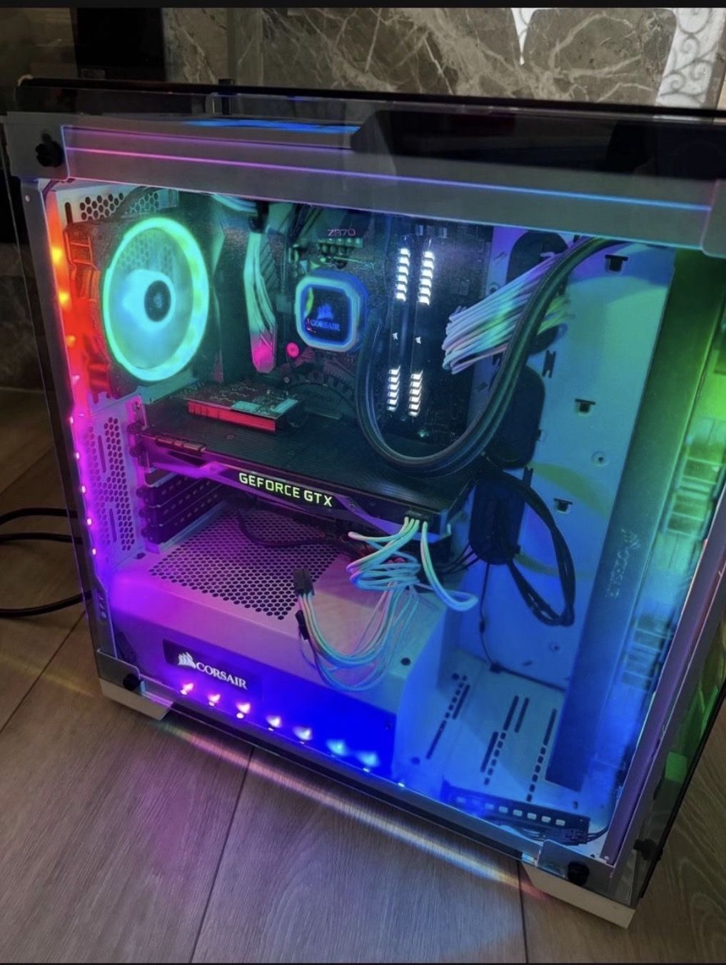 Intel i7 8700k 32 gb Corsair Rgb ram Asrrock z370 motherboard Gtx 1070 video card Corsair rm850x power supply Asus WiFi card No hard drive Corsair CP-(contact info removed) Premium PSU Cable white Corsair rgb strip Corsair Hydro Series H150i PRO RGB AIO Liquid CPU Cooler, 360mm Radiator, Triple 120mm ML Series PWM Fans, Advanced RGB Lighting and Fan Software Control Corsair LL Series LL120 RGB 120mm Dual Light Loop RGB LED PWM Fan 3 Fan Pack with Lighting Node Pro Corsair CORSAIR Crystal 570X Tempered Glass