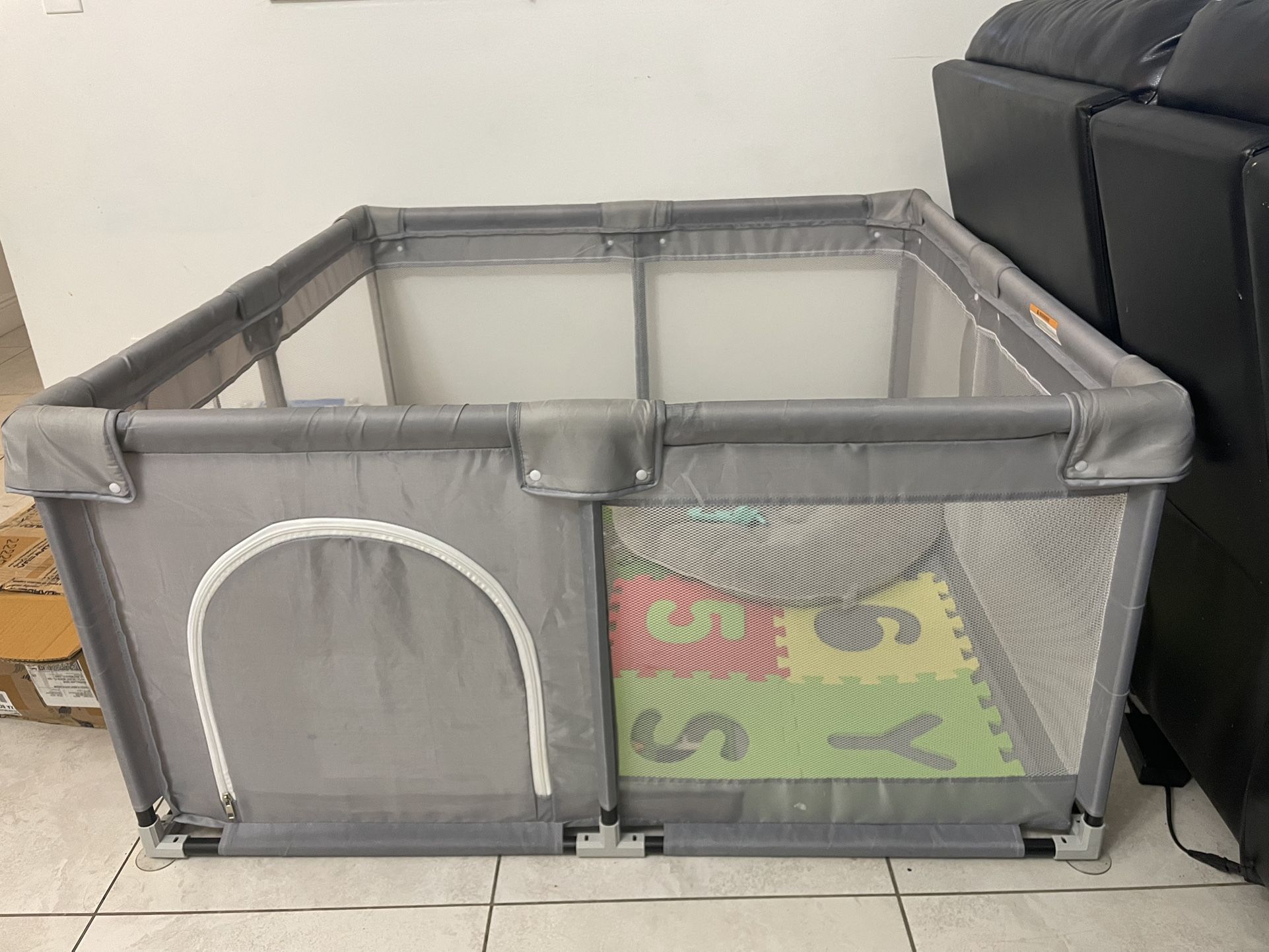 Great playpen for younger kids. Nice size and convenient for independent play.