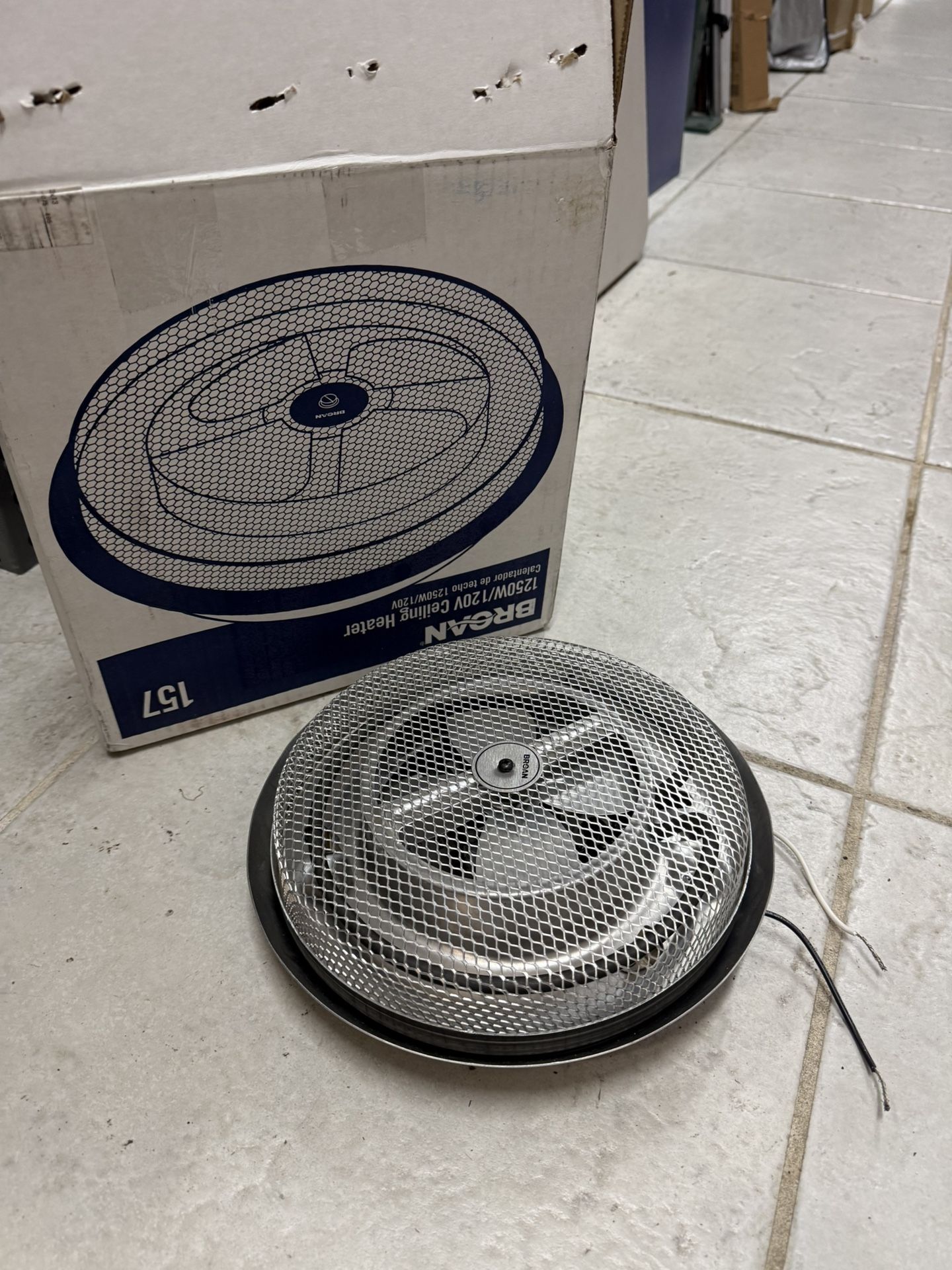 Open box Item- 157 Brand: Broan-NuTone 1,250-Watt Surface-Mount Fan-Forced Ceiling Heater Enclosed, sheathed element produces 1250-Watt of heat at 120-Volt power to disperse warmth evenly Automatic overheat protection Durable aluminum construction Built-in fan helps distribute heat uniformly Low-profile design mounts easily to a standard 3-1/2 in. or 4 in. round electrical box or 4 in. octagon ceiling box Satin aluminum finish complements any interior decor Meets UL listing safety standards for indoor use only Measures 11 in. Dia x 2.8 in. H