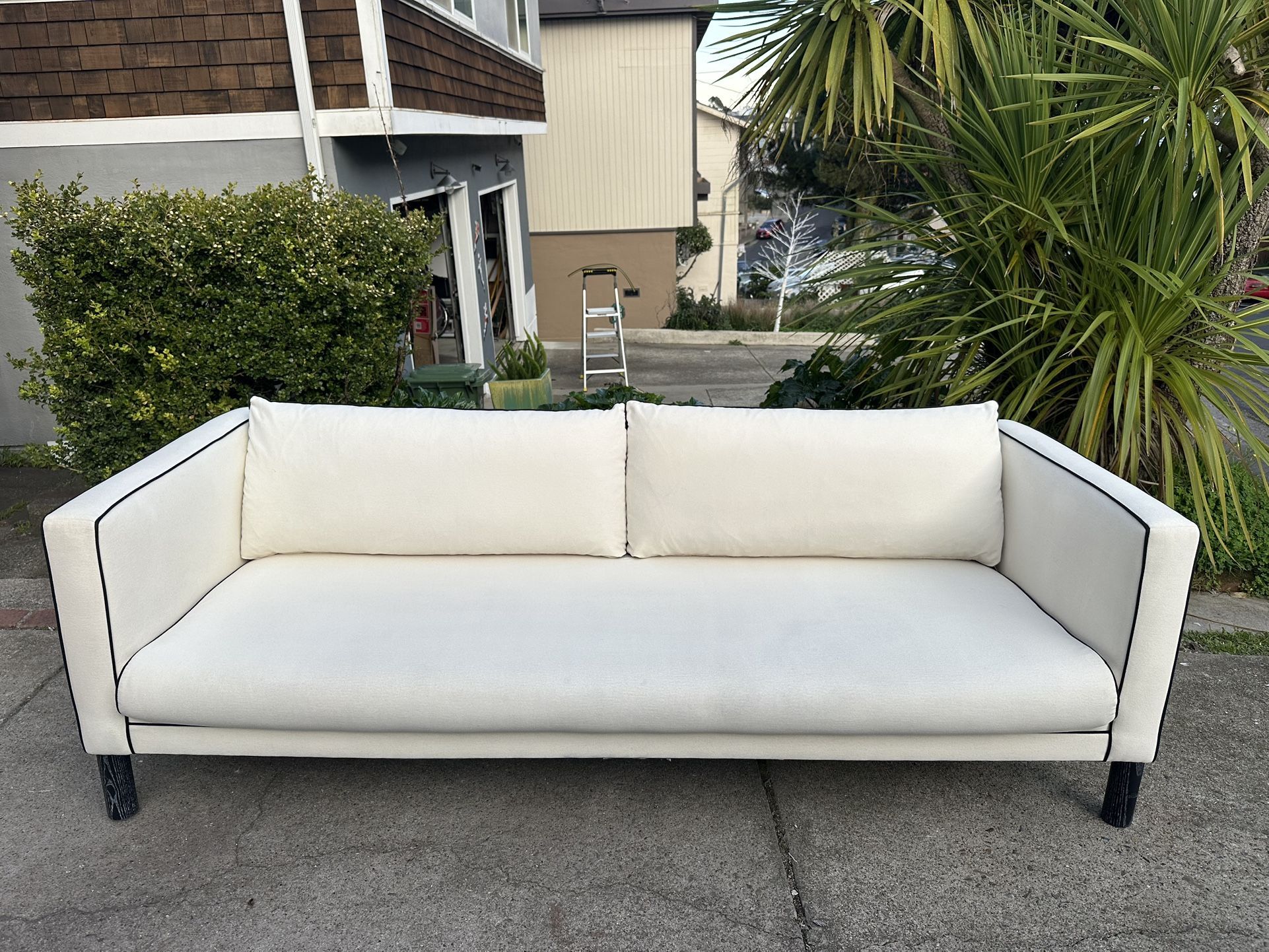 Riffing on the urbane elegance of 1930s furniture design, our Lecourbe sofa updates modern minimalism with understated details. Offering a comfy bench cushion backed with two pillow cushions, the sofa is upholstered in a felt-like ivory fabric that deftly handles cocktail spills or pizza-night mishaps. Contrast welting in black traces the high track arms, while exposed maple legs rise beyond the base finished with ebony stain with ivory ceruse. Popular in Art Deco furniture, this method of finishing wood uses a pigmented wax to set off the grain against the stain. A Crate and Barrel exclusive, the Lecourbe sofa is made with hardwood that has been certified by the Forest Stewardship Council (FSC), the environmental gold standard for responsibly managed forests. Cleaned and washed. No damage. Original price around 3000$. Measurements: For measurements, see pictures. Free delivery within 15 miles. (Note: Free delivery is to the door of the house or building, if you need help to enter it, we do it for an extra charge). We accept credit cards with an additional 3% charge.