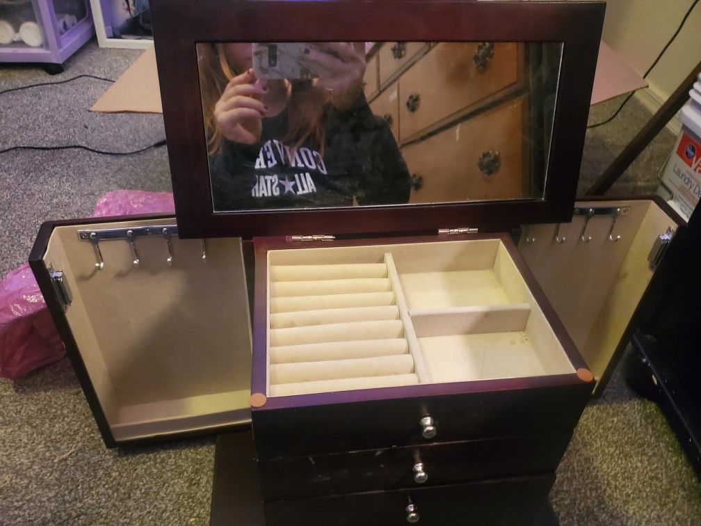 Has a mirror, in that spot has things for earrings or rings, and then 2 mini spots for stuff. 2 side doors with hooks for necklaces. 4 storage drawers. Perfect for putting on a desk or in a vanity room for extra room.