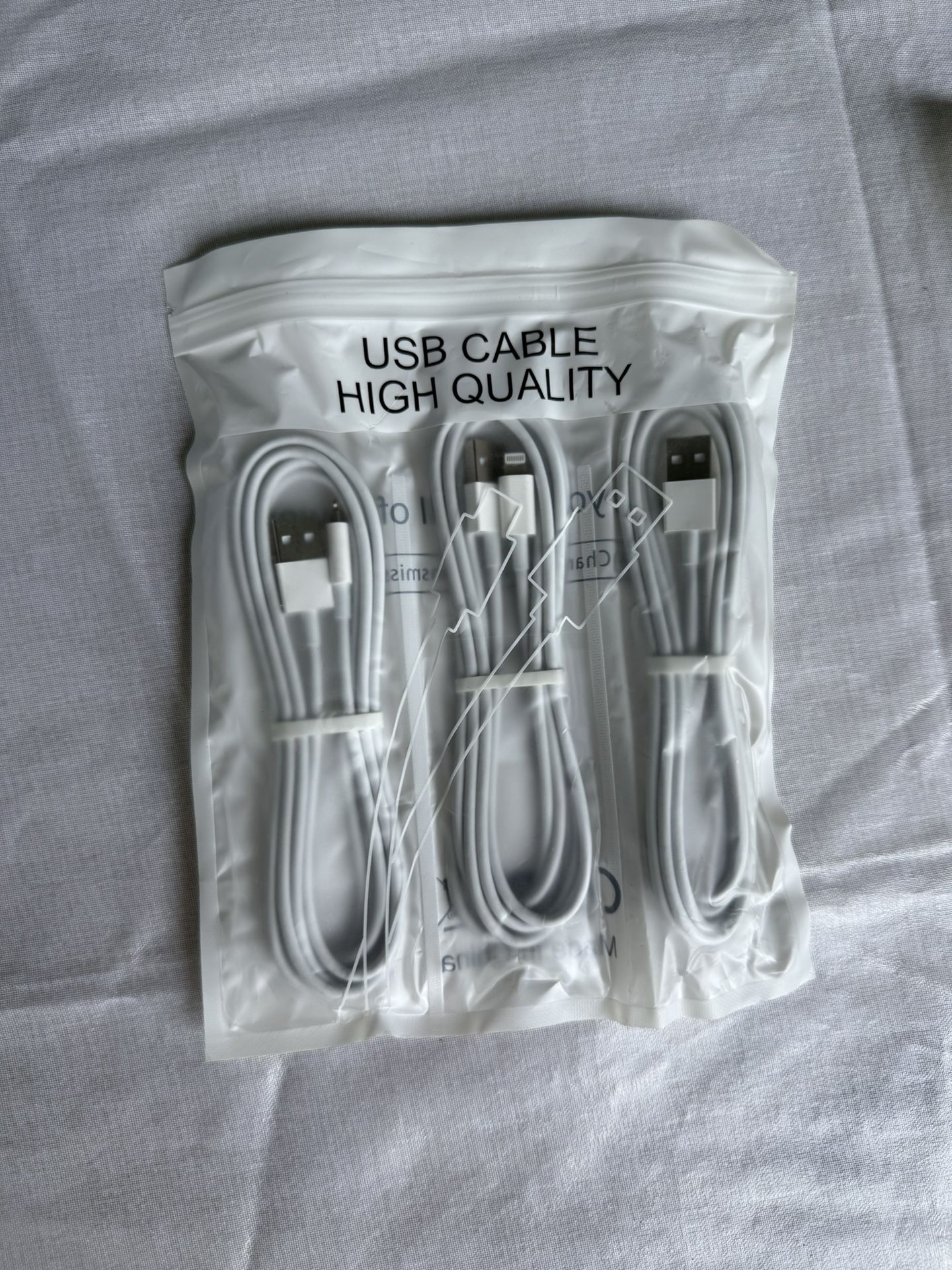 Brand new iPhone charging cables – never used, still sealed. Extra-long 6.5 ft cords for home, car, office, or travel. • USB-A to Lightning • Fast charging • 3 cables per pack • Works with all iPhones with Lightning port Only 4 packs available. Pickup only – Kailua Walgreens or Target Cash / Apple Pay / Venmo accepted.