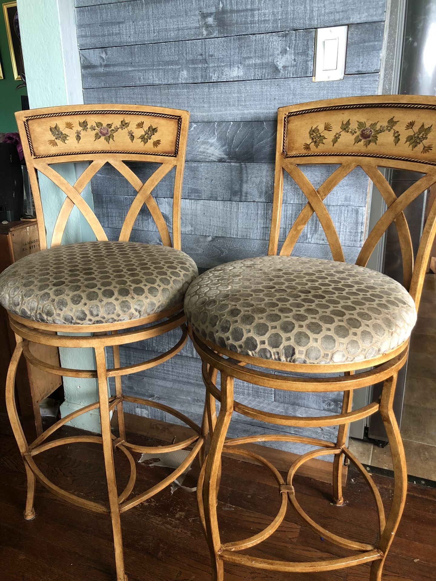 French style bar stools (heavy) with cut velvet seats in powder blue and beige. New padding and fabric with some spots. Rub wear on backs and corners of iron ware. Heavy stools-