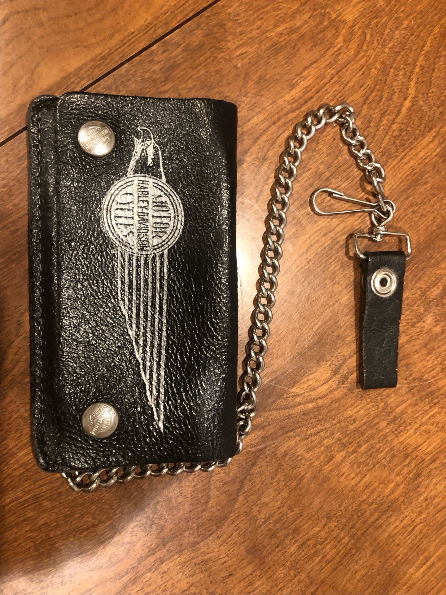 Wallet secured by two buttons s with Harley Davidson logo and a chain