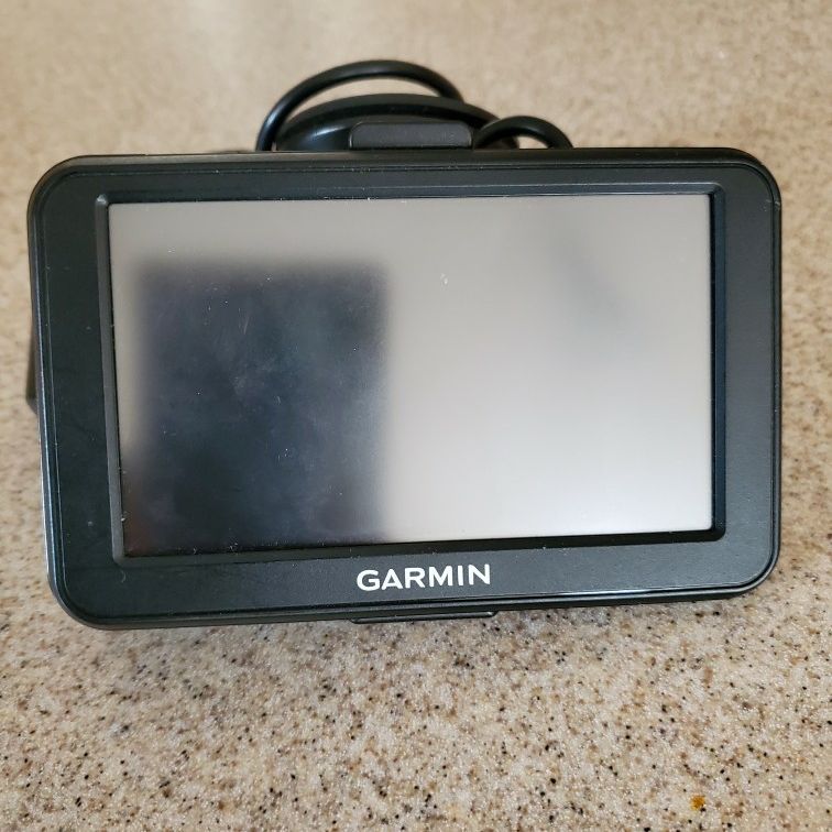 Garmin GPS. Has a connection for the cigarette lighter adapter. Comes with windshield mount. Works fine.