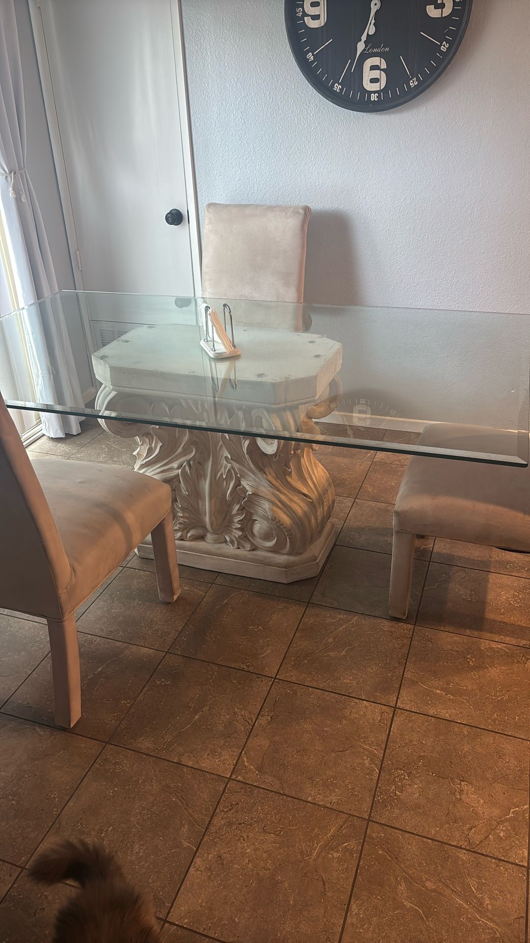 Beautiful glass dining table with 3 chairs included. Creme color. Glass has scratches but table looks great! Base and glass are super heavy. Must pick up with truck and help! Selling because I want something smaller. Dimensions: 6ft L x 42 in W x 29 in H
