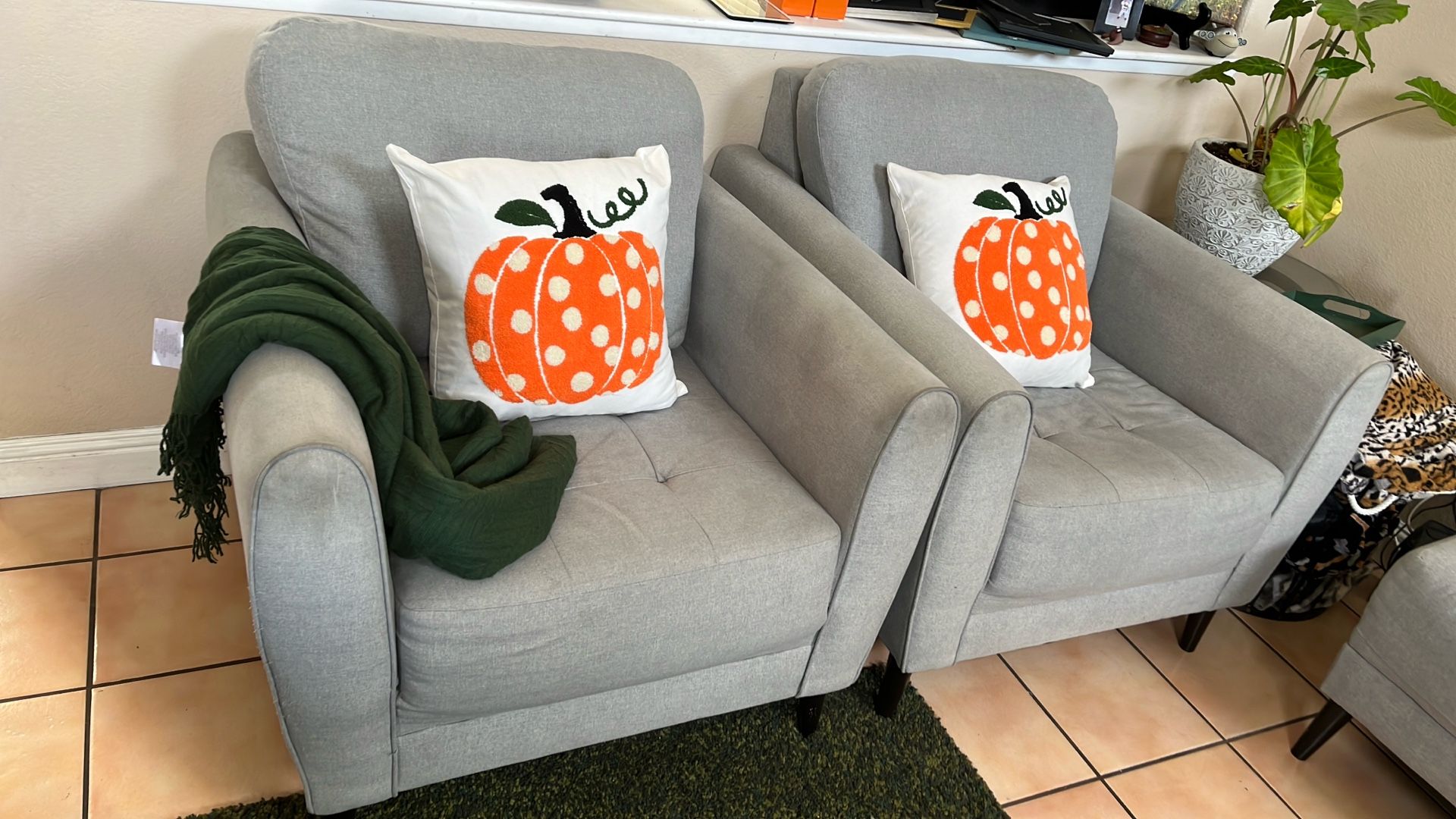 Two. Chair with ottoman. Light gray sol together. Not separate. No delivery. Serious buyer pls.