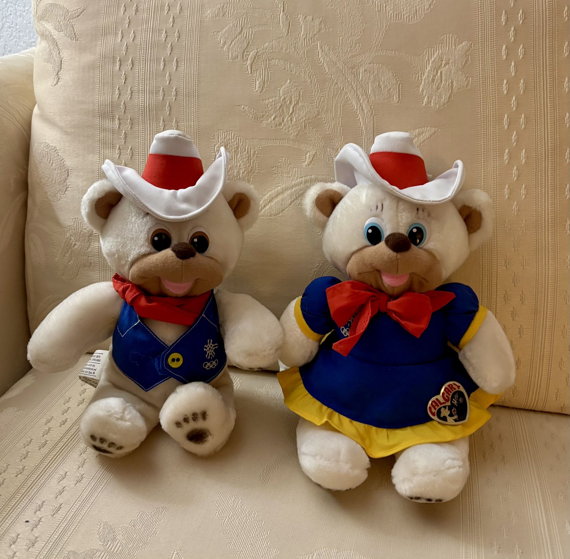 Hidy and Howdy, polar bears were two welcoming mascots representing Western Canadian hospitality in 1988. Never used but displayed in a glass case in the children’s room at the public library each Olympiad for many years. Priced as set.