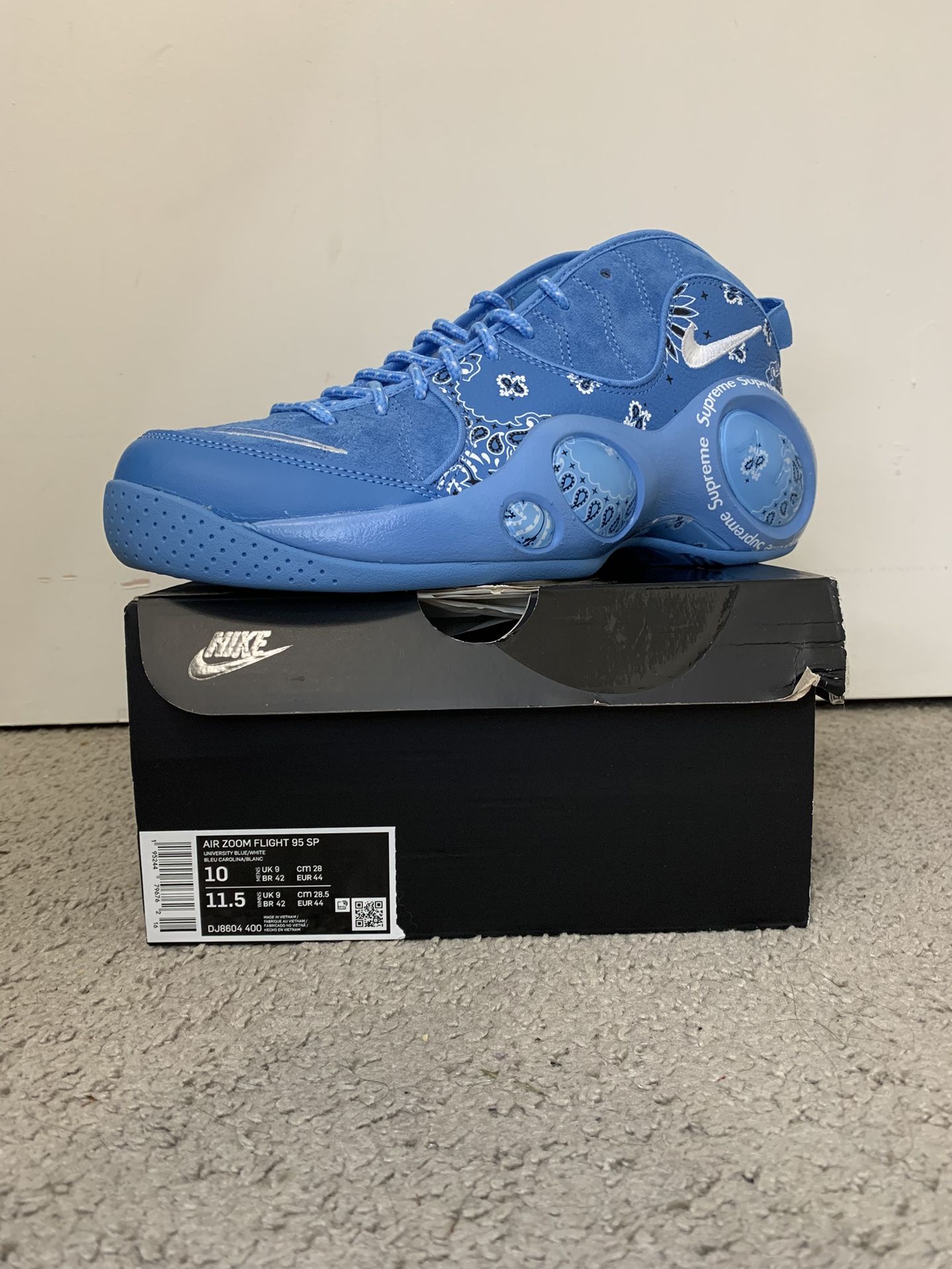 DS NIKE AIR ZOOM FLIGHT 95 SUPREME PAISLEY SIZE 10 UNIVERSITY BLUE COLORWAY AIR JORDAN