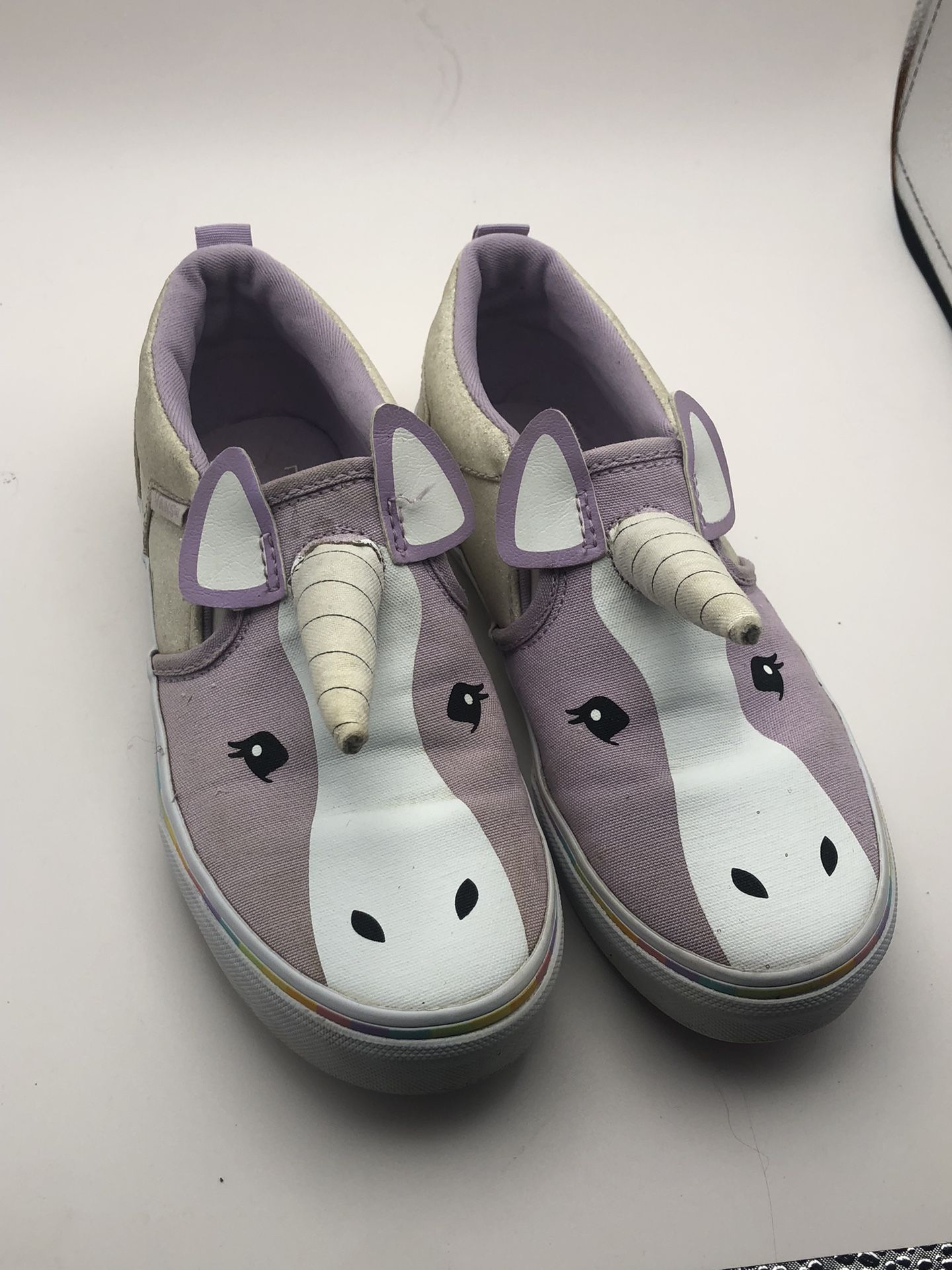 Fun slide on shoes one spot on one shoe by the unicorn horn shown in picture