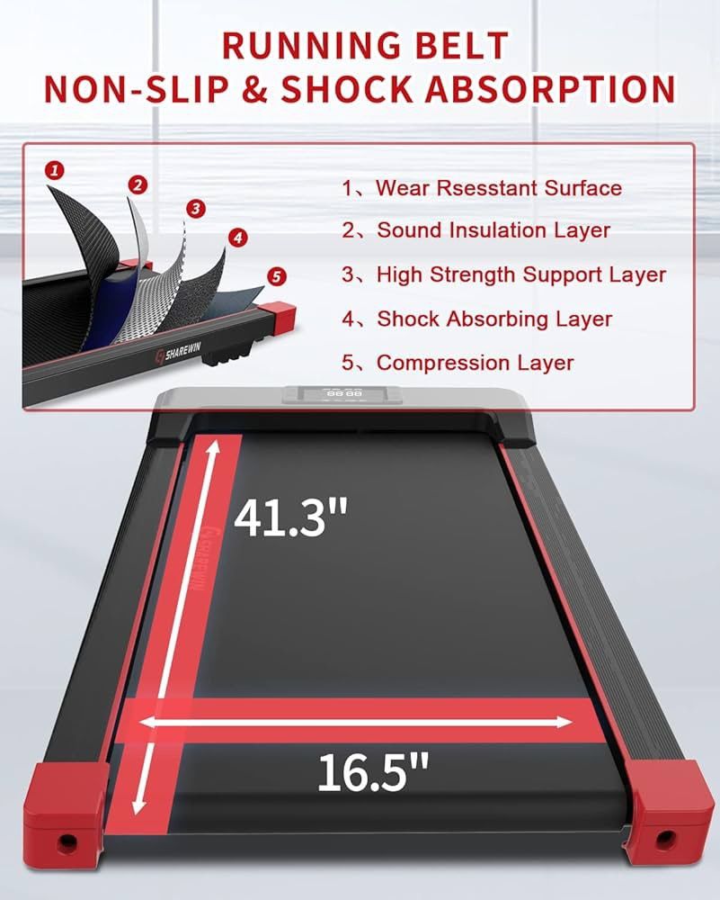 L585 Under Desk Treadmill, Walking Pad Treadmill 300 lb Capacity, Desk Treadmill Exercise Machine with Remote Control and LED Display, Electric Small Treadmill Walking Jogging Machine for Home and Office Use Colour Black Product grade Home Product Dimensions 122D x 51W x 13H Centimetres Item weight 20.41 kg Material Acrylonitrile Butadiene Styrene (ABS) 1.【Innovative Under Desk Treadmill】 --- SHAREWIN desk treadmill has 12 programs available for you to choose, and these easy-to-use exercise programs help to improve your cardiovascular fitness, boost your health, and burn fat. 2.【Non-slip Big Running Belt】 --- The 41.3” x 16.5” large-area belt is made of 5 layers of high-quality non-slip rubber. Not only can it provide more space for you to walk and run, it also has a strong shock absorption function to protect your ankles and knees. 3.【2.5HP Powerful Montor】 --- With 2.5HP low-noise motor, desk treadmill can carry up to 300 lbs of weight and also ensure a quiet and comfortable environment for running at home. At the same time, the 2.5HP motor can reach a maximum speed of 0.5-6KM/H, it not only suitable for running, but also very under the table for office use. 4.【Play & Bluetooth】 --- The multi-function LED display tracks speed, distance, time and calories in real time, ensuring a high-quality and effective workout on the treadmill at home. Bluetooth design can insure your to enjoy beautiful music while exercising. 5.【Easy to Move And Store】 --- Our walking pad treadmills requires no assembly and are ready to use right out of the box.With built-in wheels for easy transport and storage under sofas, beds and tables. NBWJCK-C1BK886001