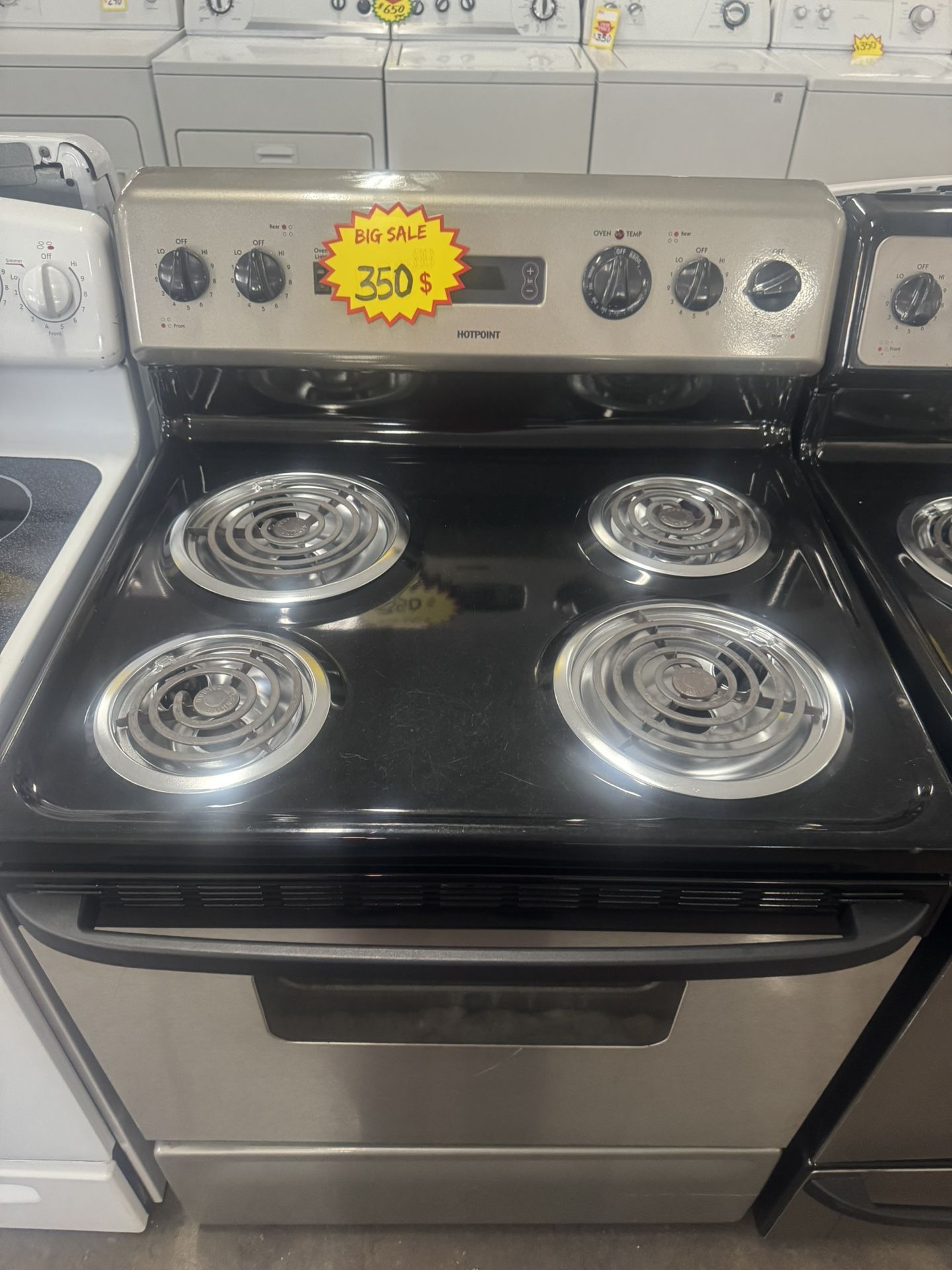 Used good good conditions HOTPOINT electric coils stove 30” wide grey and black color Working good , 90 days warranty We offer delivery and installation for extra charge We have financing available through Acima Credit.