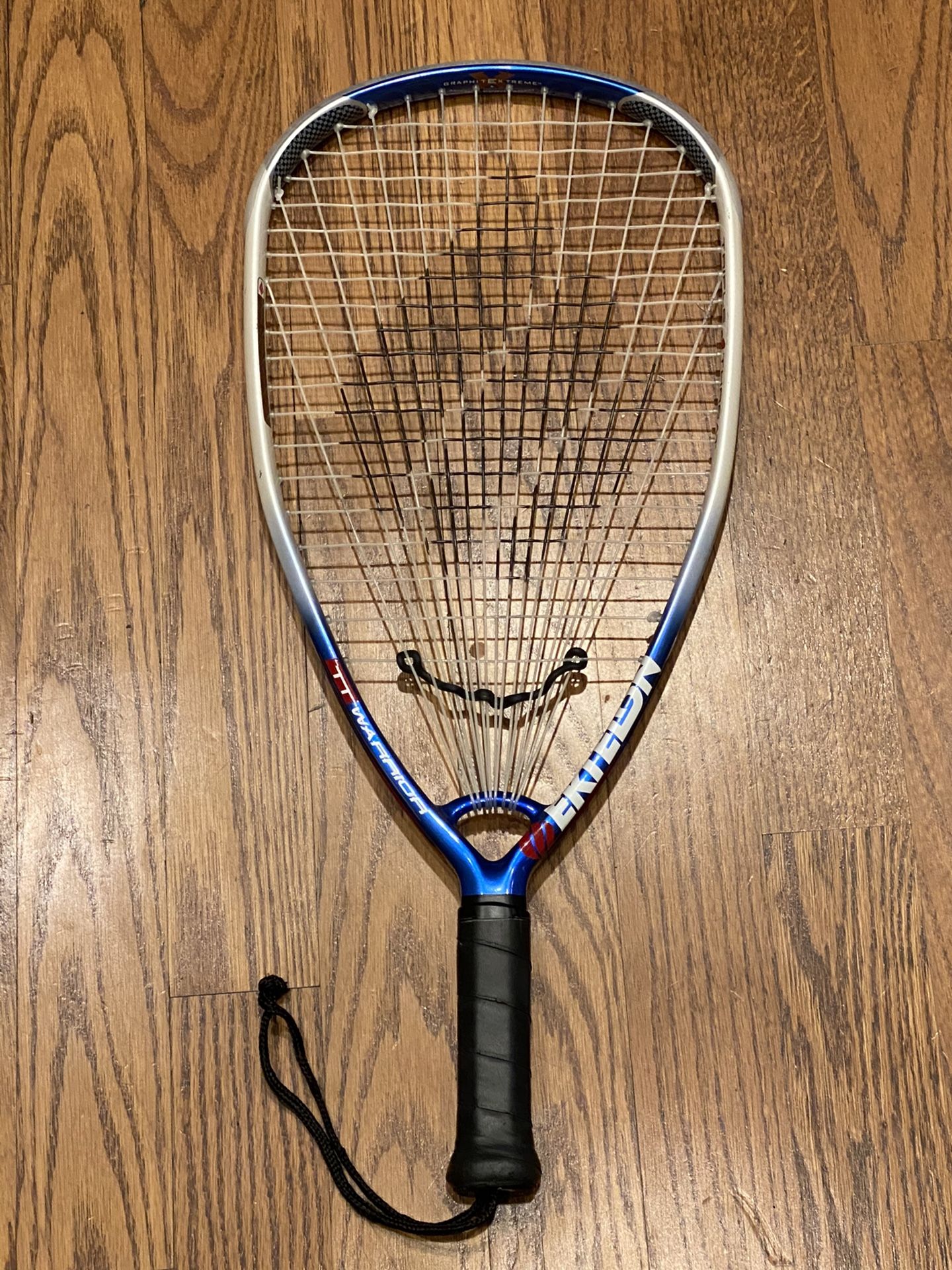 This is a Ektelon TT Warrior Triple Threat 1700 Power Scoop Racquetball Racquet. This racquet is preowned. No missing string and no major wear to the handle. There is some minor wear at the bottom of the racquet, but overall this is in EXCELLENT CONDITION and a MUST have if you're into racquet ball. This racquet was kept in good care. No wear or chipping or cracking of the print on the racquet. No major dings, dents or scratches. Hit the courts with this great racquet. This item comes from a smoke and pet free home.