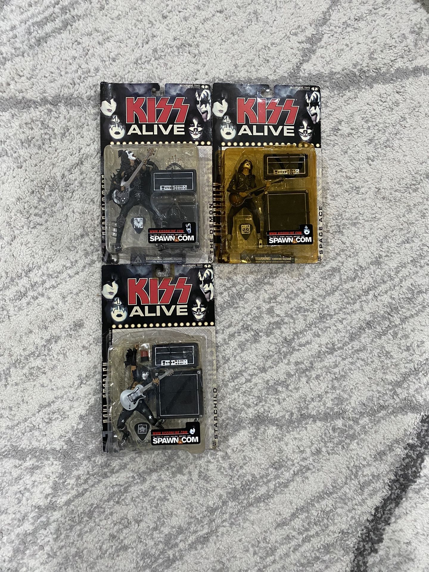 McFarlane Toys Kiss Alive set of 3 music figure. Brand new in box. Discoloration and damaged on some of the packaging. Gene Simmons, Paul Stanley and Ace Frehley only. Not looking for any trades.