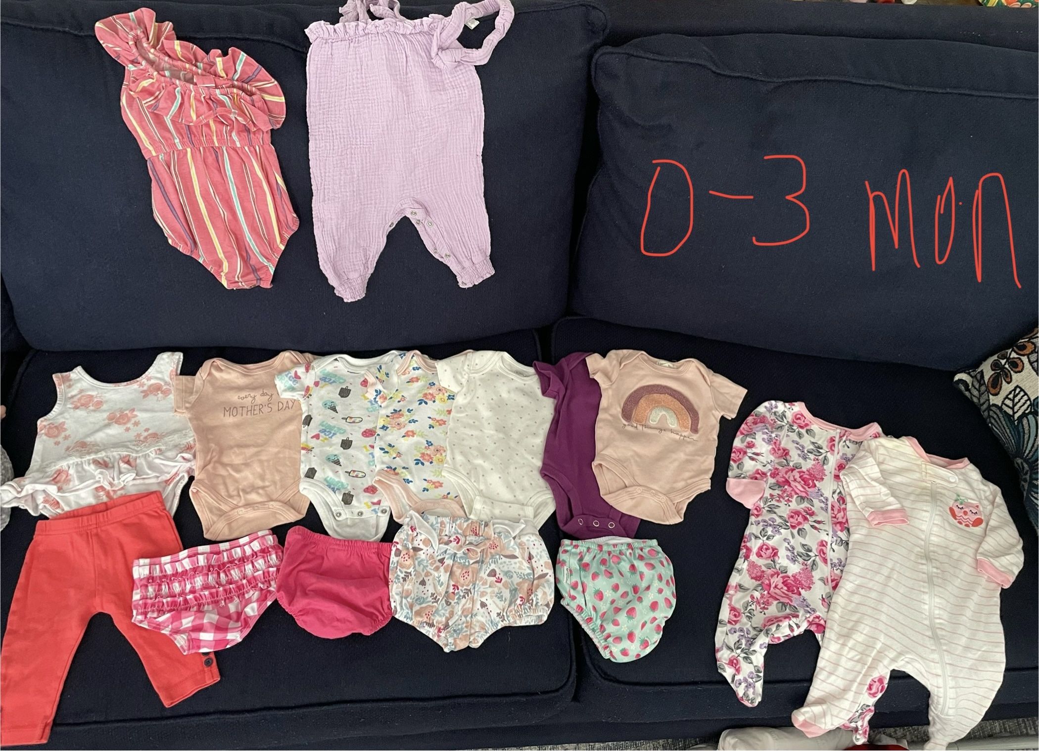 Look at all of the pictures but this comes with Nb-18 month clothing, shoes, socks, bibs, blankets, car seat cover, hooded towels . All in great condition.