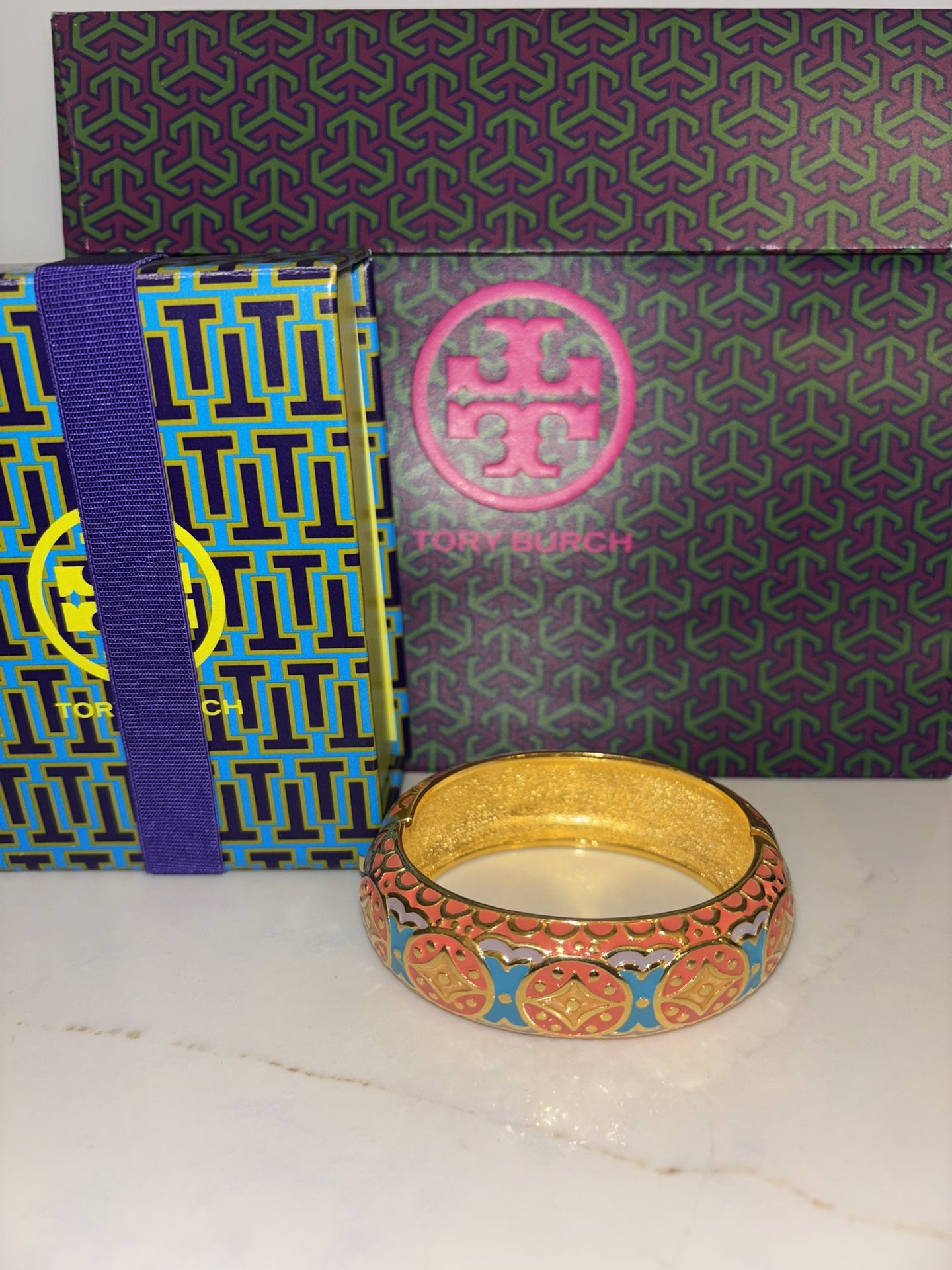 Signed Joan Rivers vintage 1990 collectible oval hinged bangle enamel bracelet in a vibrant orange, blue, and lavender pattern on a gold-tone finish. Has an inner circumference of around 6.5 inches designed to fit an average wrist size comfortably, can fit wrists up to 7 inches. The inner dimensions of the oval shape are around 2 inches by 2.75 inches when closed. The width of the bangle itself is about 7/8 inches wide (just under an inch). Bracelet will be shipped in Tory Burch Jewelry box and Jewelry Gift Bag!!!!