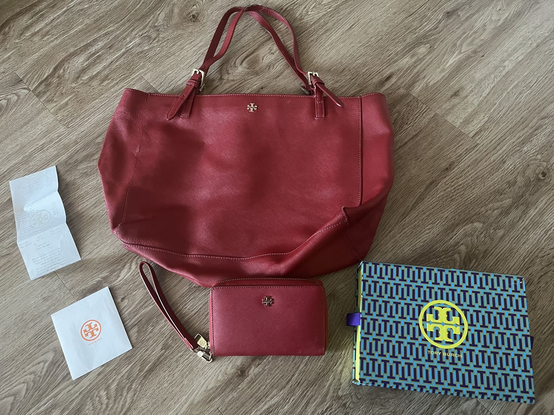 York Buckle" leather Tory Burch tote bag in Kir Royal red. It measures 16" wide, 11" tall & is 5 1/2" deep at the bottom. It has adjustable buckle straps, gold hardware, a zippered padded center pouch for a laptop or Ipad, a large zippered pocket with 2 other pockets on one side & the other side has 2 pockets. There are stains in the inside and one handle worn see photos. There is key ring hardware & fabric lining, & it was purchased at Tory Burch Store. I am selling the York Multi Task Smartphone Wallet looks brand new. It’s have a receipt Bag was $295 and $155 for wallet.