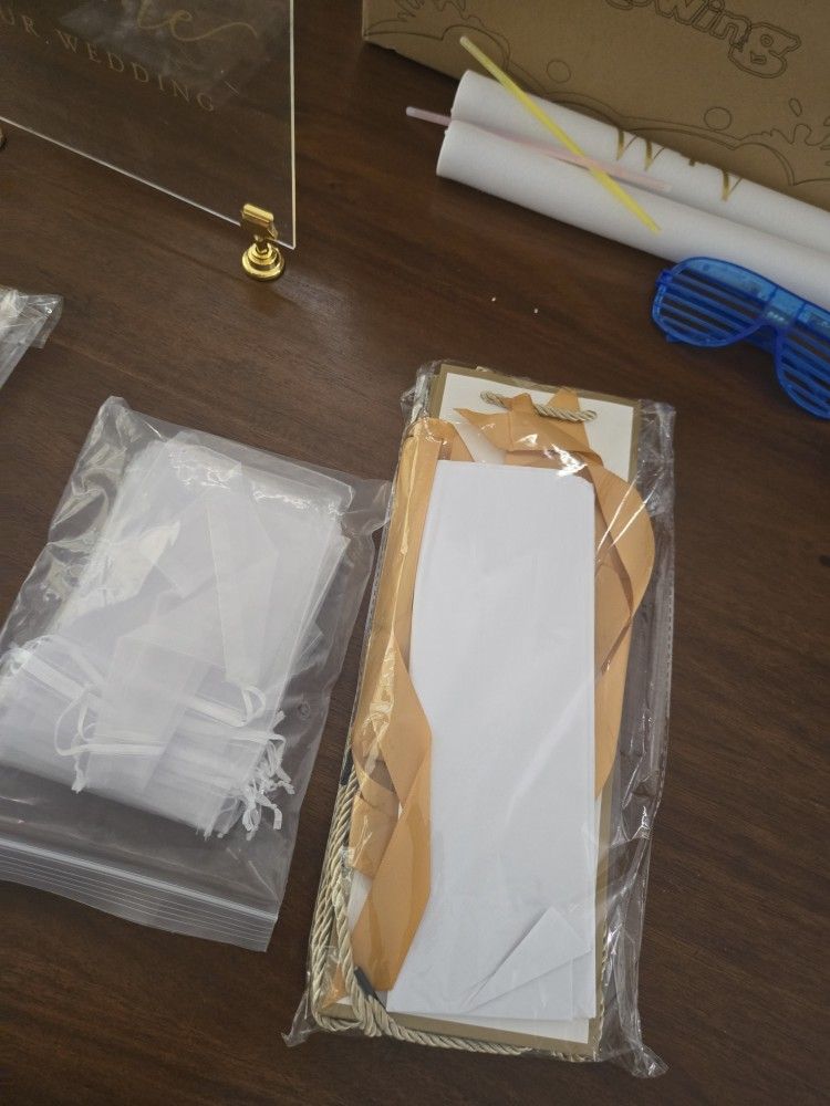 Wedding Decor and wedding favors for sale. Selling everything. Gold picture frames. Wine bags Gift favour Glow sticks, glow foam, and light up glasses Wedding shoes size 10 Table # holders or pictures holders. Flower girl basket with flowers Fund or card box. Letters are removable Selling g all together or individual Prices negotiable. Everything must go Moving sale