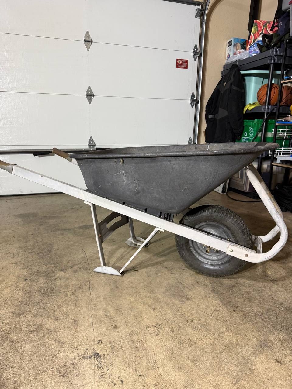 Sturdy metal wheelbarrow in good working condition. Shows normal signs of use, but fully functional. Great for gardening, yard work, construction, or hauling soil and debris. Pickup only