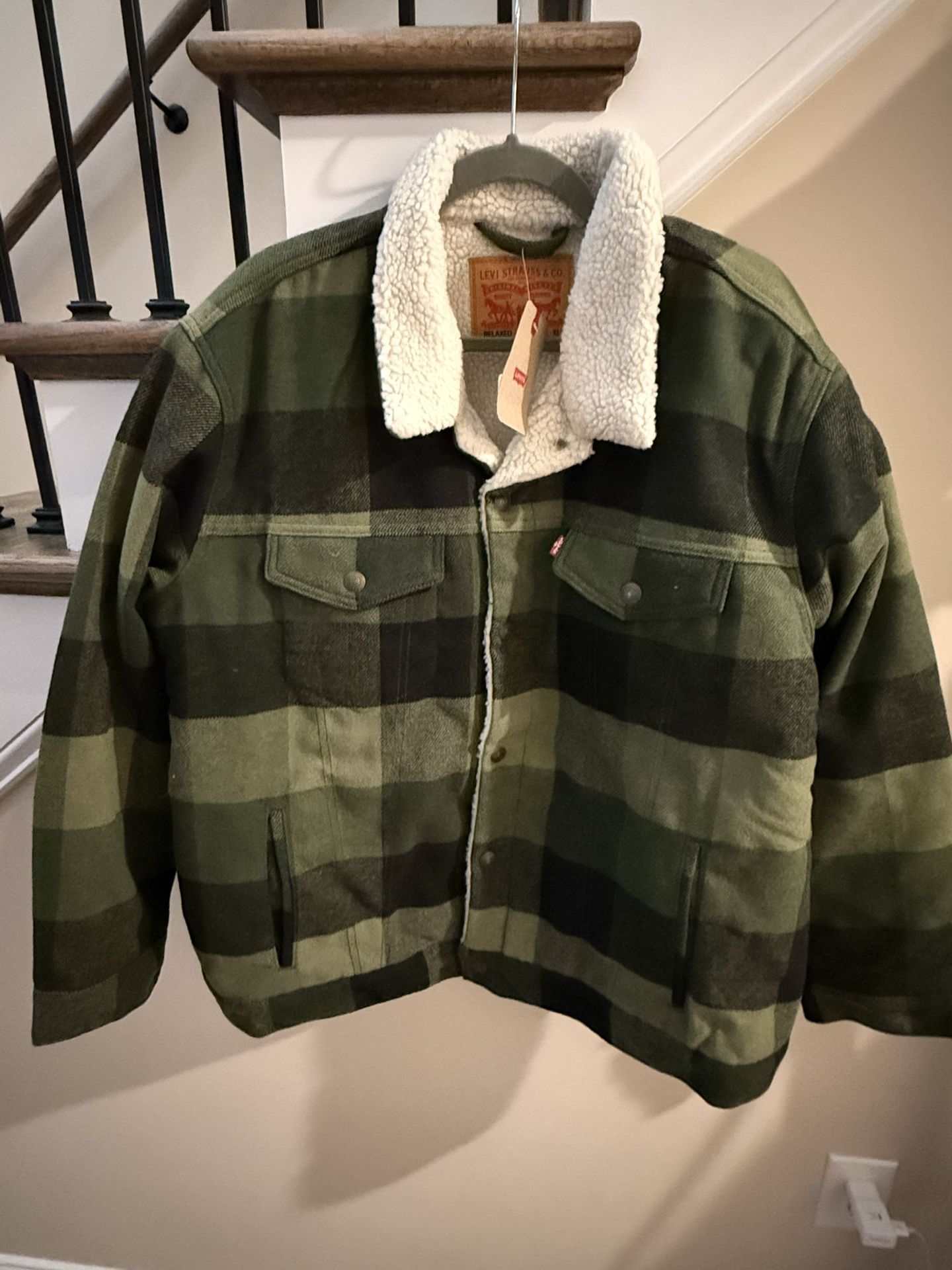 Durable denim, lined with Sherpa. Men's XL, never worn and still with the tag on it. Plaid duffle bag green.