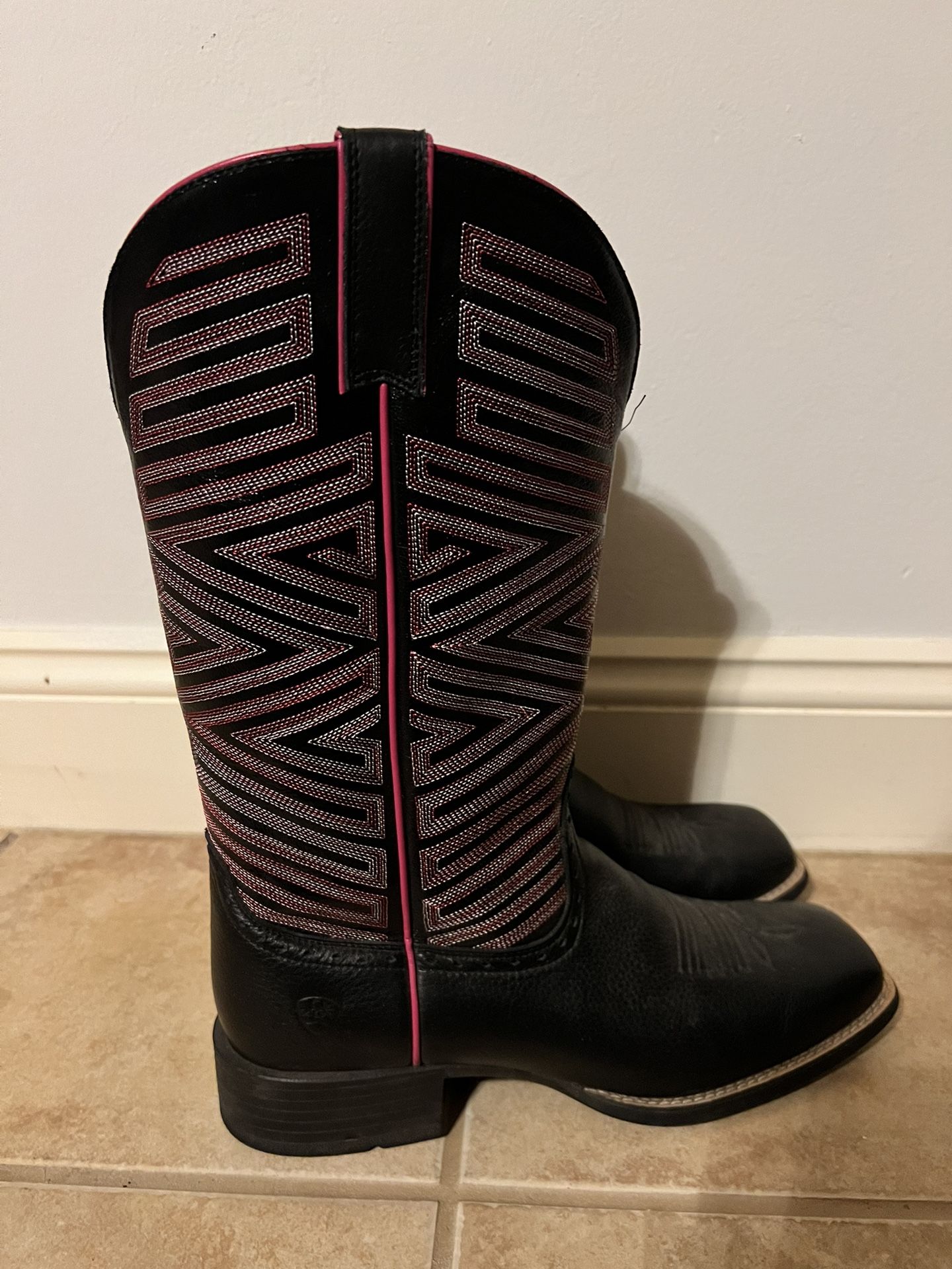Like new - barely worn. Ariat square toe women’s boot. Size 11B. Pink and black. Style 10017368