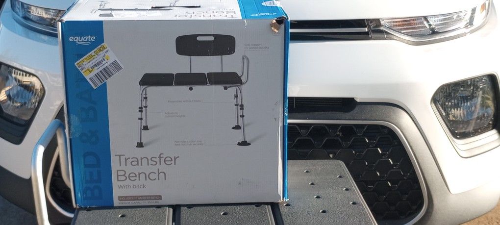 Equate. Transfer Bench adjustable height, back support, side rail, rust resistant and suction feet for tub. 350lb weight capacity