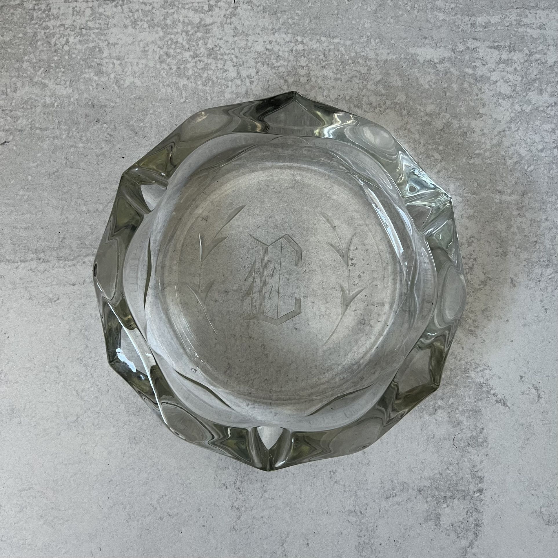 Etched ‘C’ in the middle of a heavy glass ashtray. No scratches or nicks. 7” diameter.