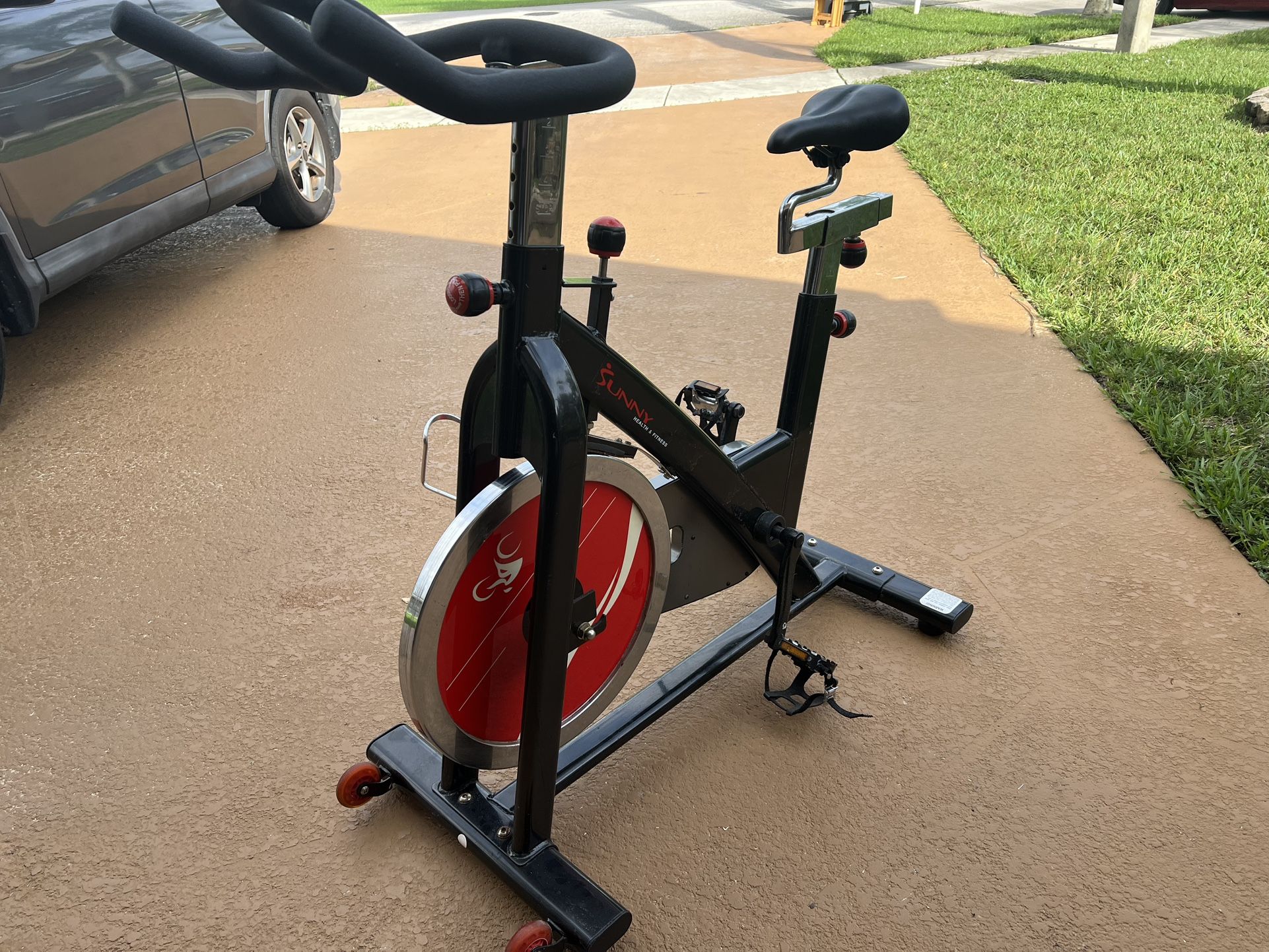 Sunny is touted as the best alternative to Peloton. Ergonomic seating and handle bars. Everything is adjustable. Great way to work out. No bike spin shoes required. Pedals have built in sneaker harness. Compact so it doesn’t take up much room in the garage or house. Bike has been used but is still in great physical and working condition. Tension knob for resistance and belt driven.