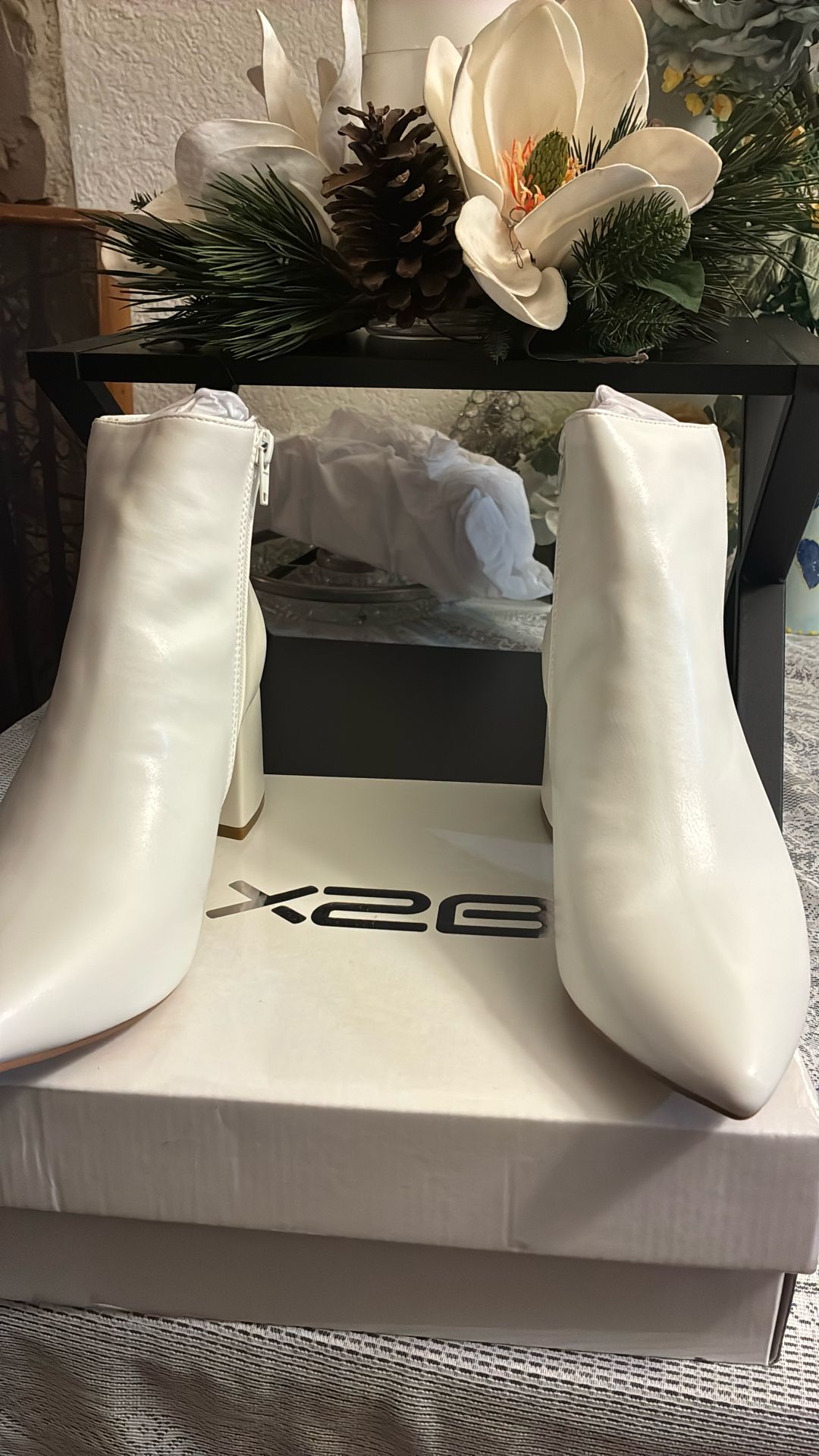 Give your outfit a chic upgrade with these sleek white ankle boots. They feature a pointed toe, side zipper for easy on/off, and a smooth faux-leather finish that looks amazing with jeans, dresses, or night-out fits. Only tried on – never worn outside.